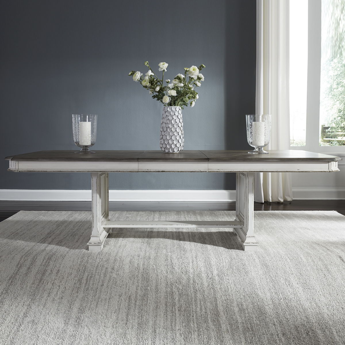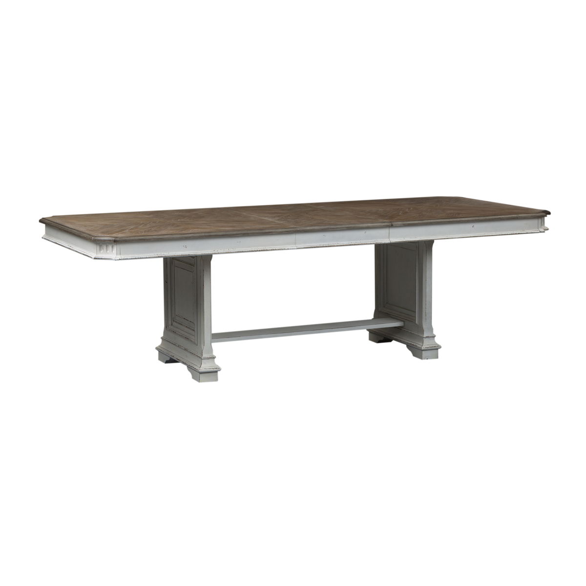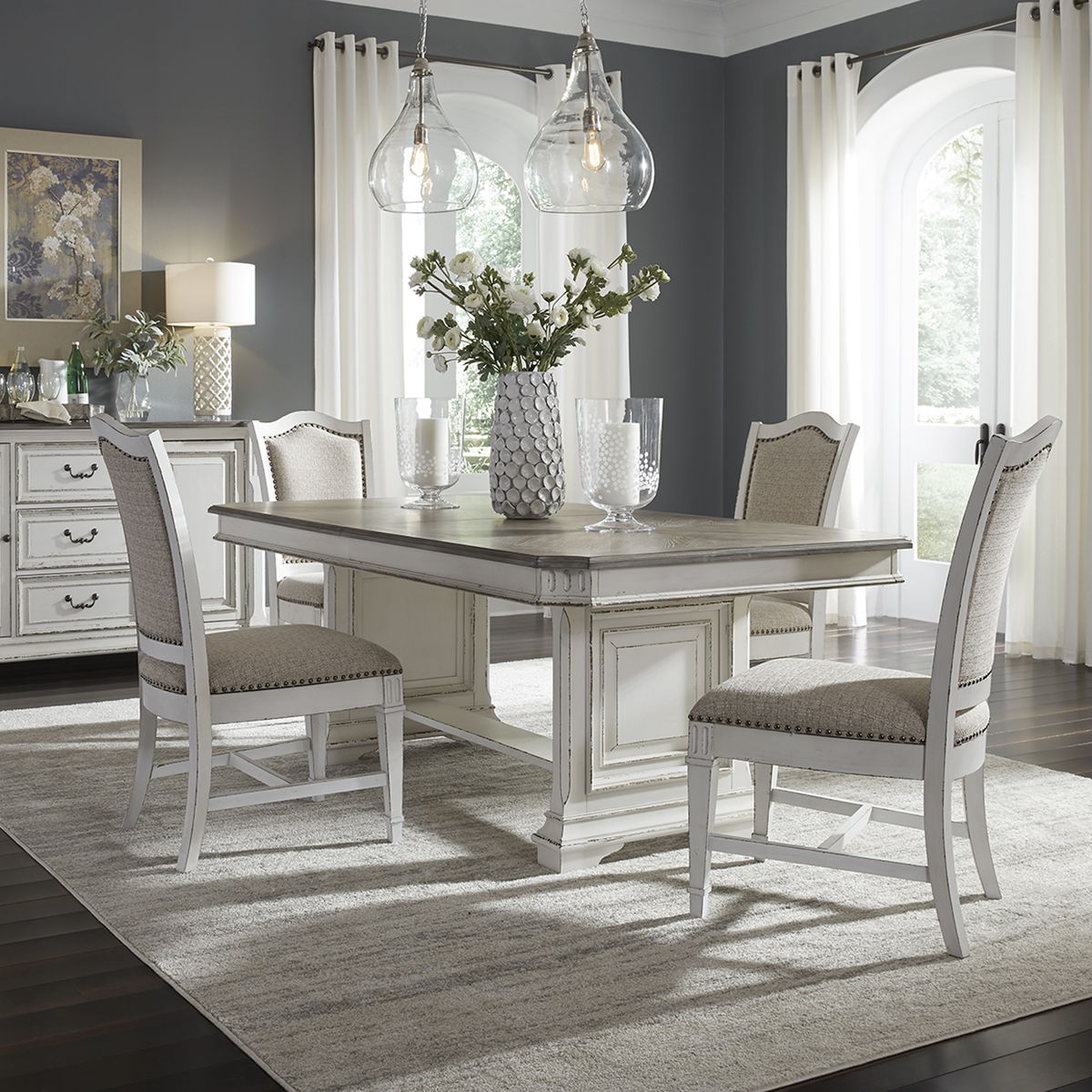 It’s never been easier to be elegant with the Abbey Park trestle table set. Crafted of poplar and rubberwood solids with cathedral white oak and birch veneers, this set features an antique white finish with heavy chipping and destressing and a weathered brown with whitewash top. This set consists of the trestle table and four upholstered side chairs. The table features a fancy face veneer design on the top with shaped corners and fluted accents, anchored by a raised panel pedestal base with a center trestle. The chairs feature chenille upholstery with a nail head trim, tapered legs with fluted accents, and nylon chair glides to protect your flooring. Blending of European traditional design influences makes Abbey Park a truly unique style for any living space.