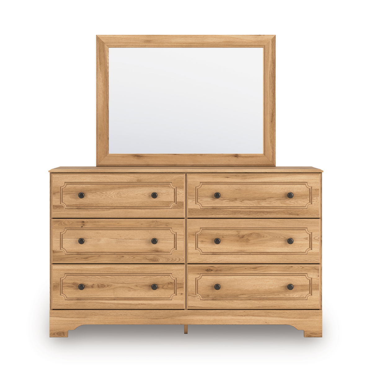 Country rustic. Vintage inspired. However you see it, you’re sure to be charmed by this dresser with mirror. Adorned with chic drawer knobs and a warm oak grain finish, it offers a relaxed mix of picturesque aesthetics. Its storage space gracefully welcomes clothes, linens and other bedroom necessities. With an air of easygoing elegance, this set lets you drift away to a simpler time and place.
