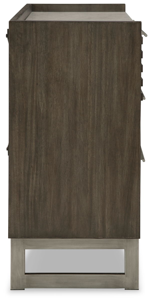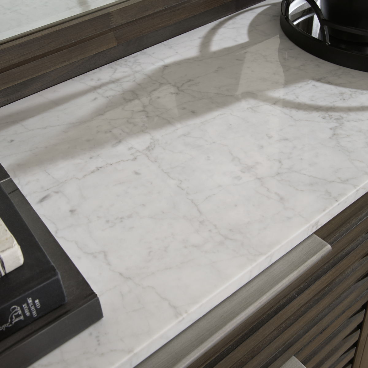 Clean lines lend sophistication and structure to this dresser with mirror. Its complex rich finish contrasts perfectly with a white marble top, while the streamlined silhouette features overlay slats to create visual interest. A metal base and bar pulls in a low-sheen steel finish add to this piece’s contemporary vibe.