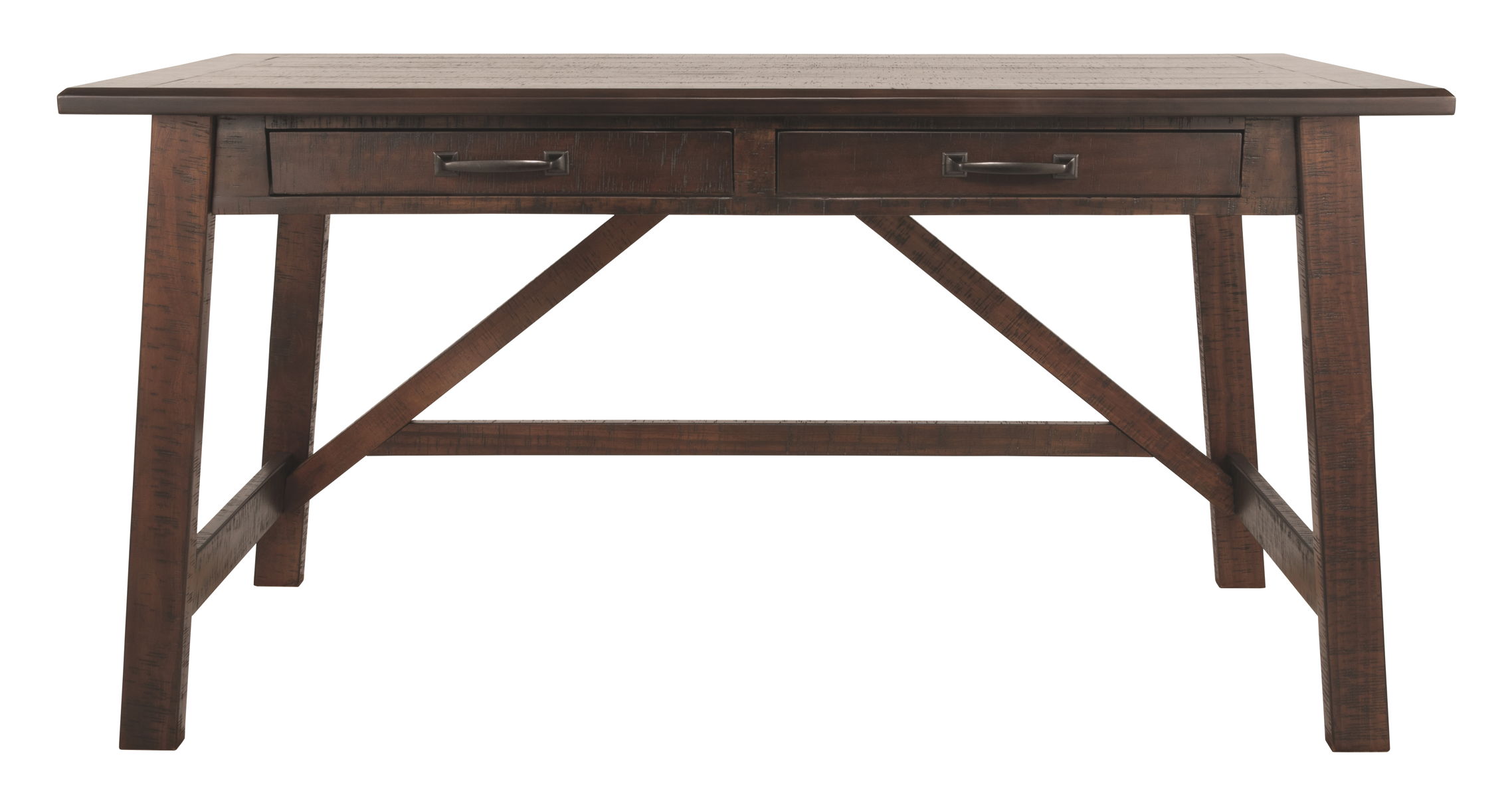 Leaning toward a casually cool look with a touch of rustic industrial flair? This home office desk with canted legs takes a fresh stance on style. Two smooth-gliding drawers with dovetail construction reflect high quality that never goes out of fashion. Saw marks infuse a touch of rich distressing. Antiqued sculptural pulls provide the finishing touch.