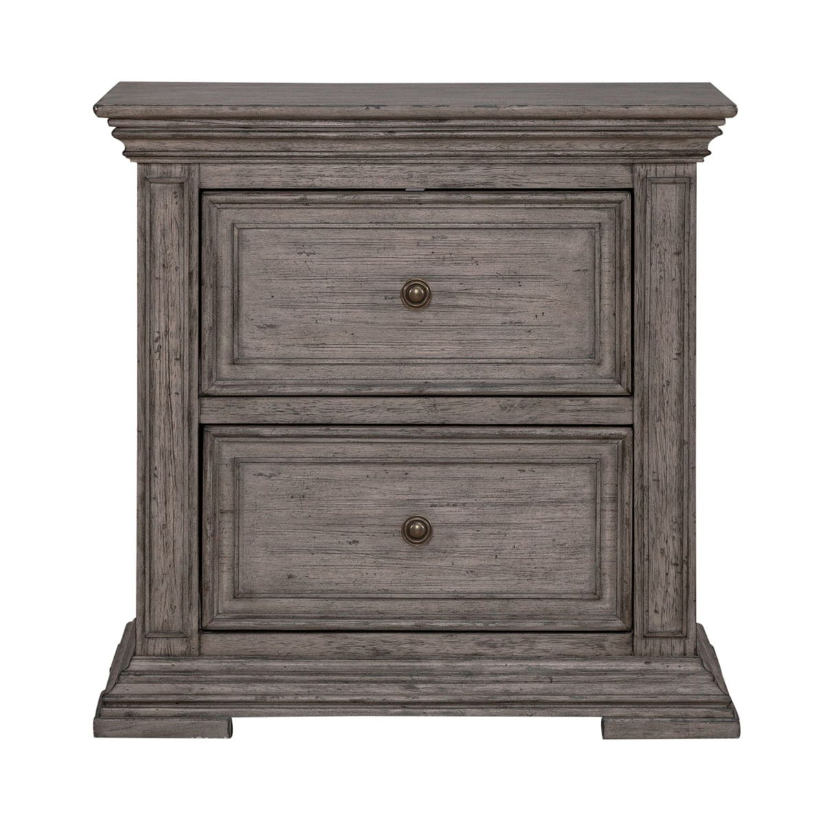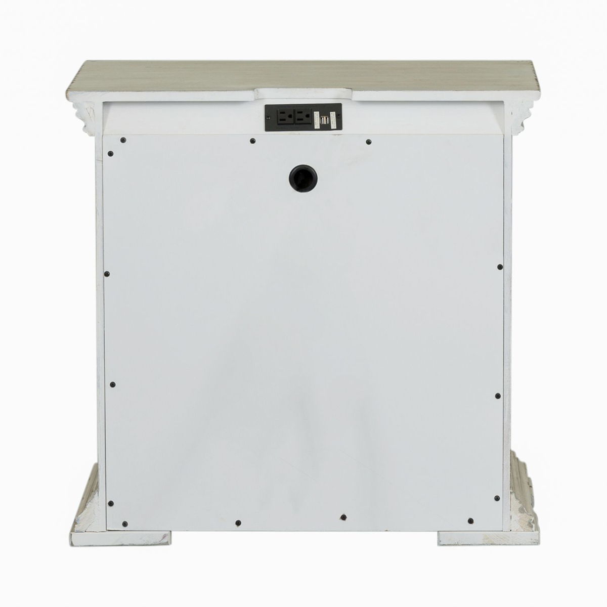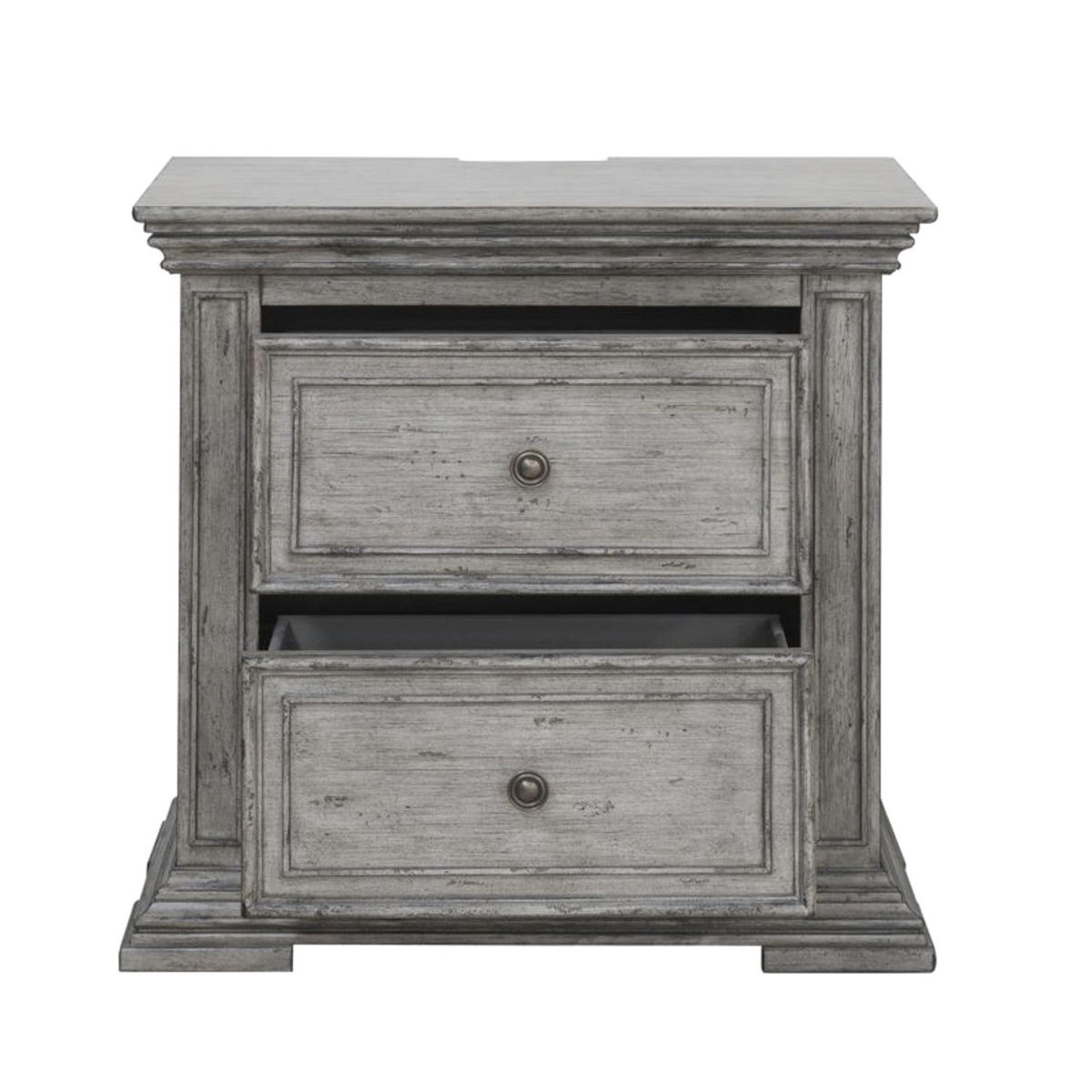 This unique 2 drawer night stand is the perfect way to accent your room with traditional living design. Accompanied by heavy distressing creates a truly unique look. Crafted with rubberwood solids and birch veneers, this night stand features fully stained interior drawers, premium felt lined top drawers and bottom case proofing, tied together effortlessly with antique pewter knob hardware. With today’s electronics in mind, this piece includes a charging stations for user convenience.