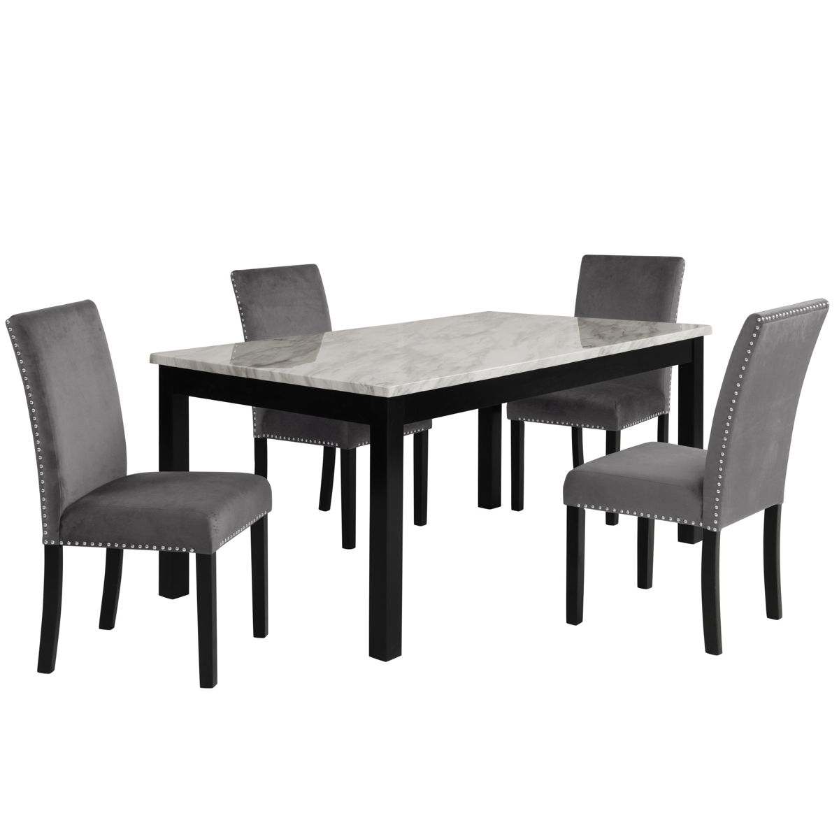 - Contemporary Glamour – The white and gray veined faux marble top glimmers against deep espresso legs, offering a sleek, modern ambiance.