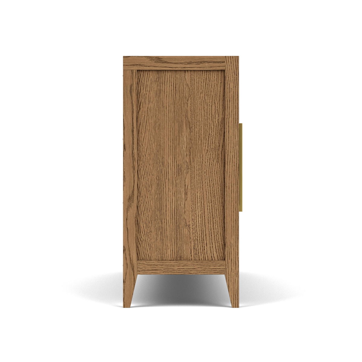 - Two pairs of wood framed glass doors each enclose two adjustable wood framed glass shelves