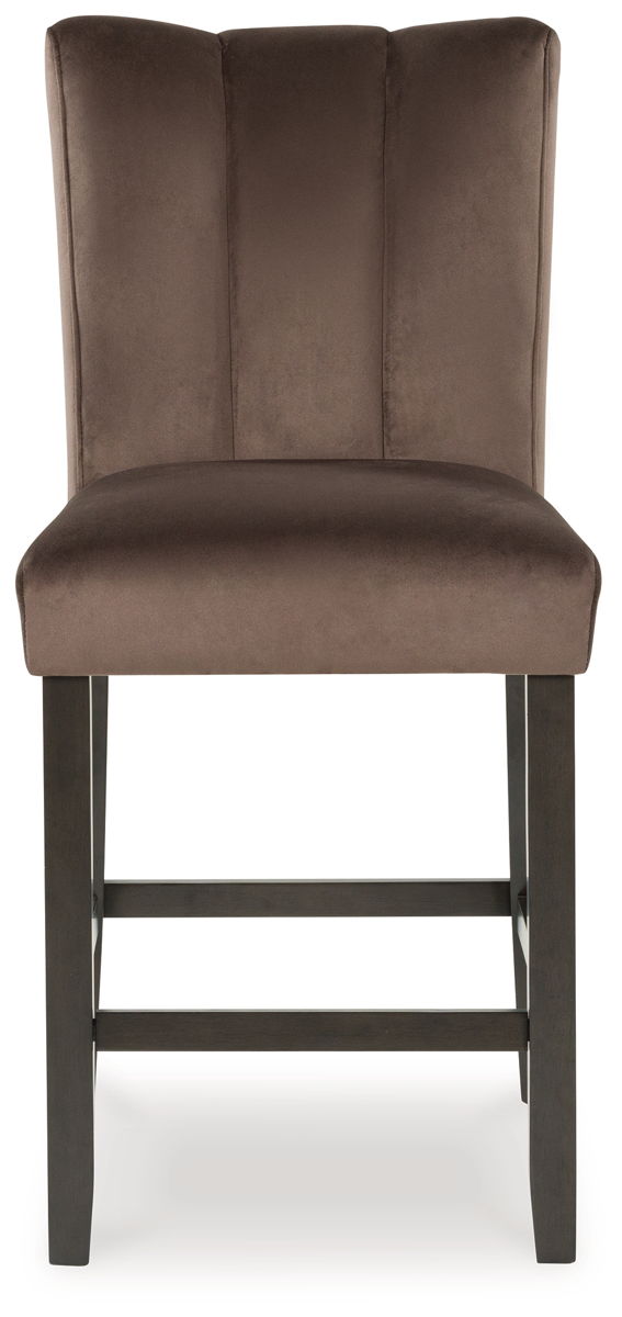 This counter height bar stool reflects your highly contemporary point of view. Its ultra-soft velvet upholstery in chocolate brown is a feast for the senses. Channel stitching details give the stool an elevated, tailored feel. What a delicious choice for an elegantly elevated dining room.