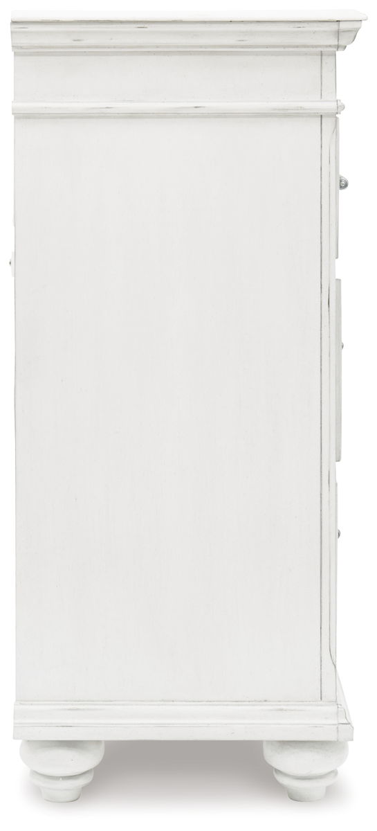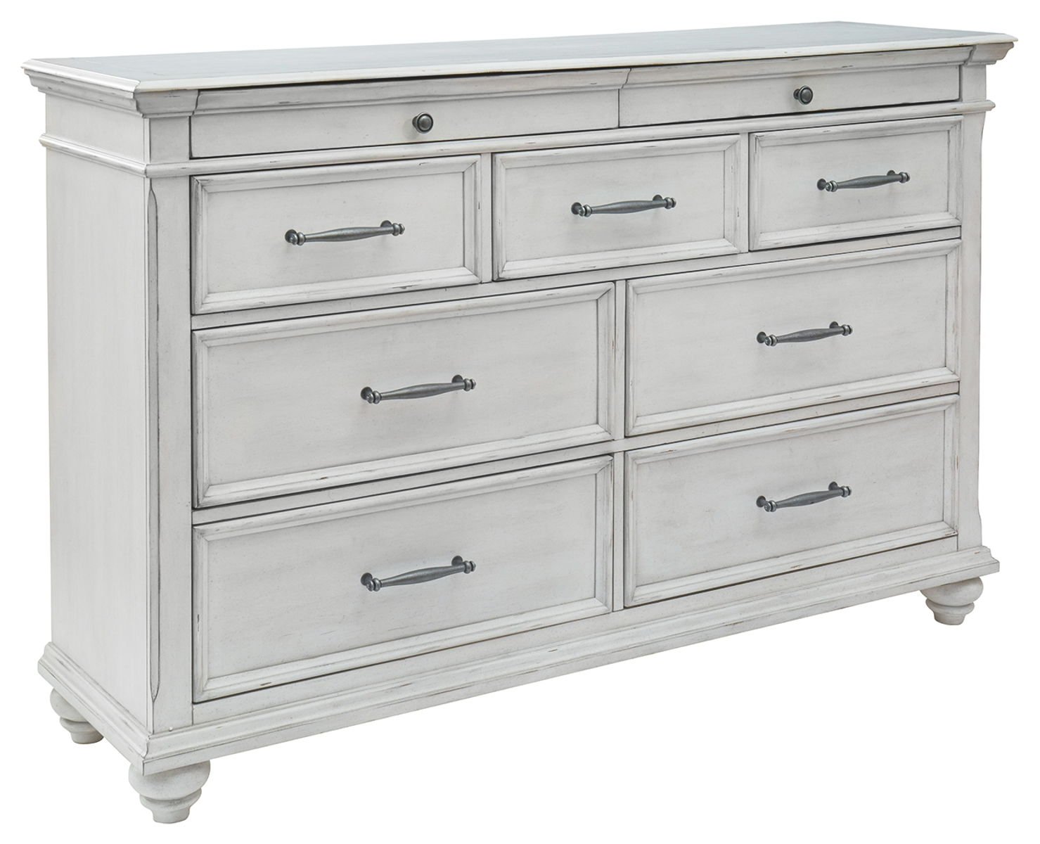 Give your retreat vintage charm and valuable drawer storage with this dresser. In a beautifully distressed whitewash finish, you’ll love putting it all away in casual style. Seven full-sized drawers and two accessory top drawers will easily accommodate your needs. Generously scaled moulding from top to bottom, along with bun feet and drawer handles with a transitional aesthetic, give this dresser character—evoking the feel of a quaint cottage escape.