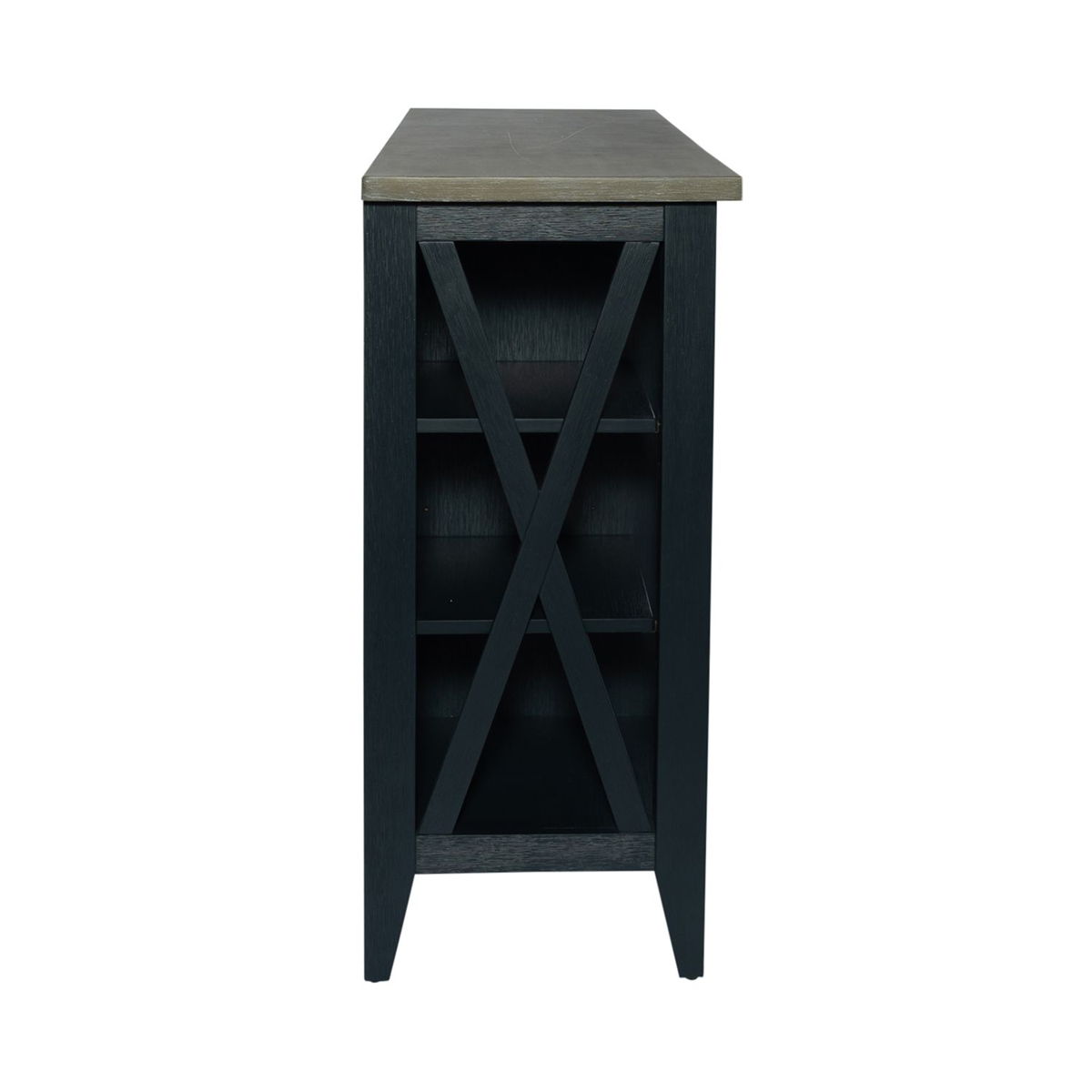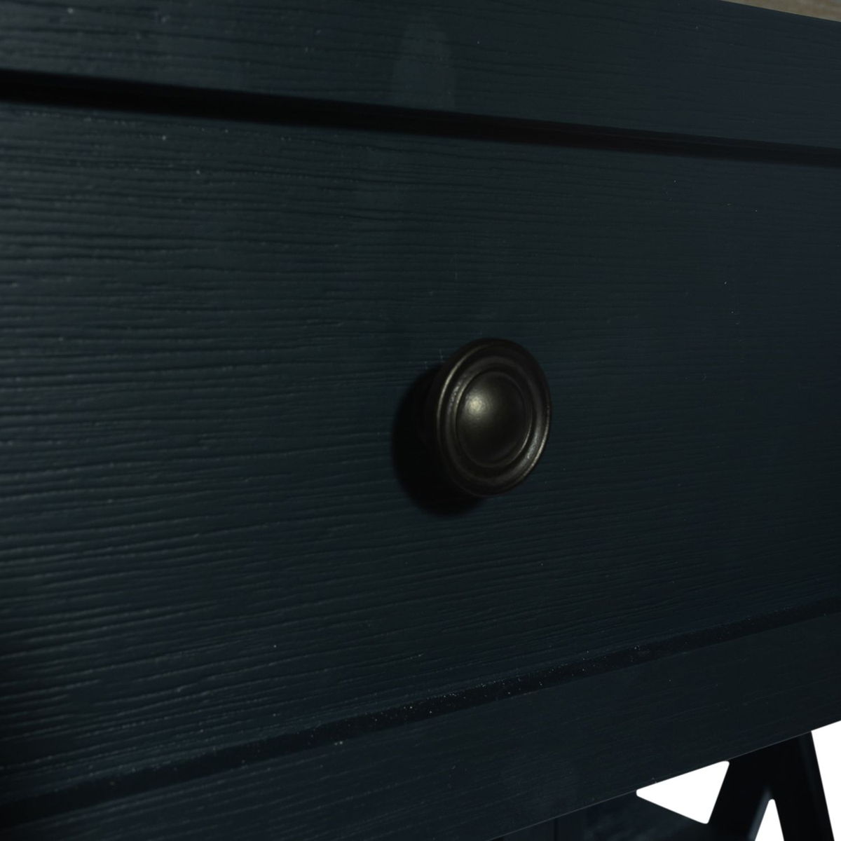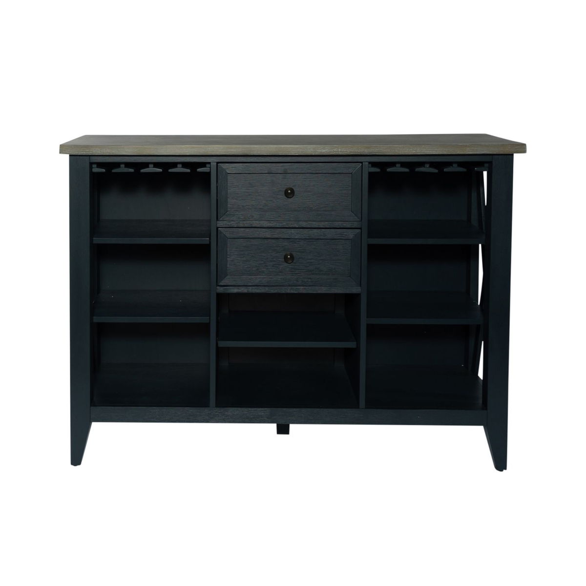 Accent your space with the Lakeshore server. Crafted of rubberwood solids with pine veneers, this piece features a two-toned navy and wood finish, two fully stained full extension drawers for easy access to storage, X accents on the end panels, stemware storage, two adjustable shelves at each end of the case and one center adjustable shelf, and is accented by dark pewter knob hardware. This server is available in an alternate finish, offering a traditional style that features warm, rich colors that are very inviting.
