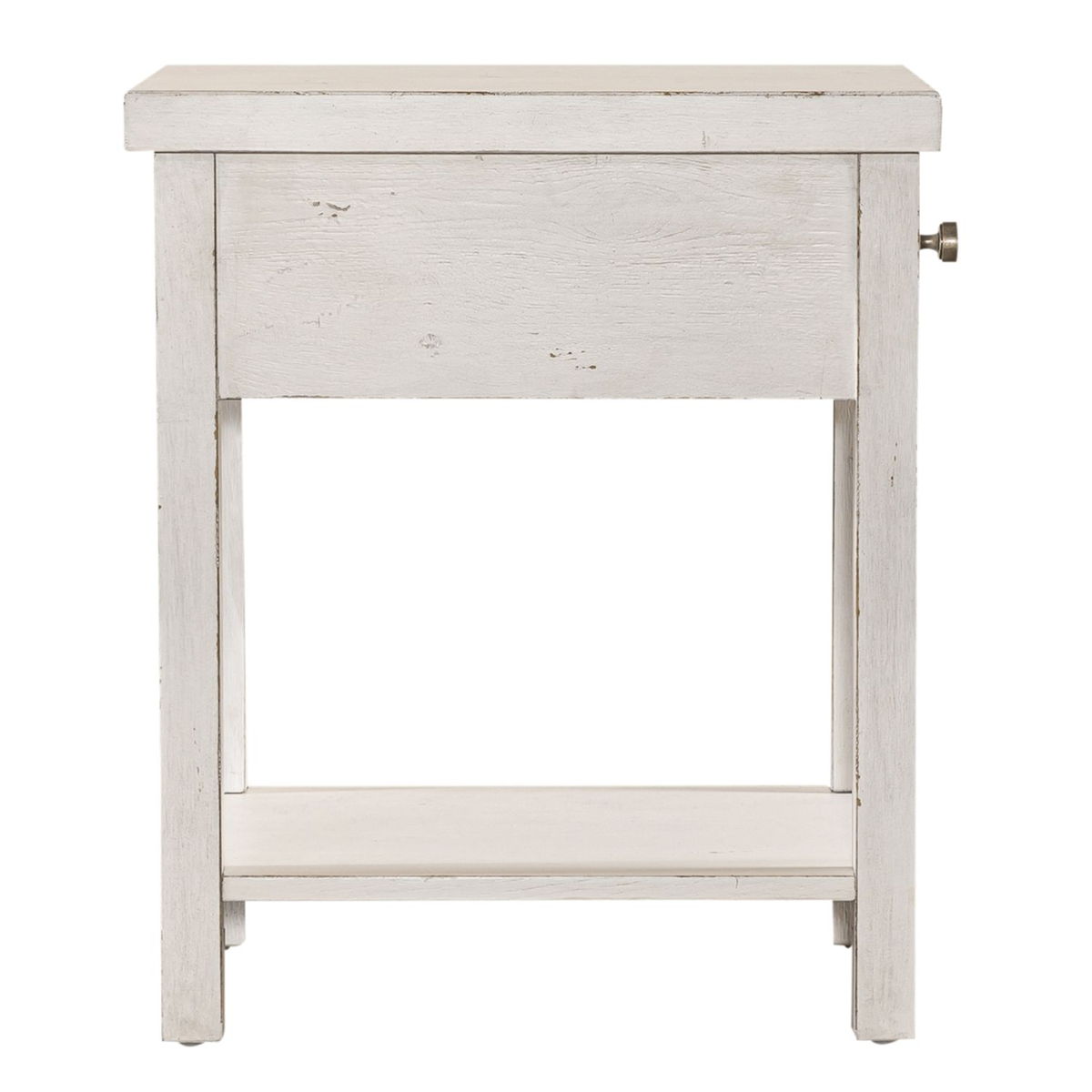 Enhance your space with the Modern Farmhouse drawer chair side table. Crafted of poplar solids with knotty white oak veneers, this piece features heavy distressing, a full extension drawer with a bottom shelf for additional storage, appealing washed brass knob hardware. Also available in an alternate finish, this modern farmhouse piece would be a wonderful addition to your cottage or contemporary style space.