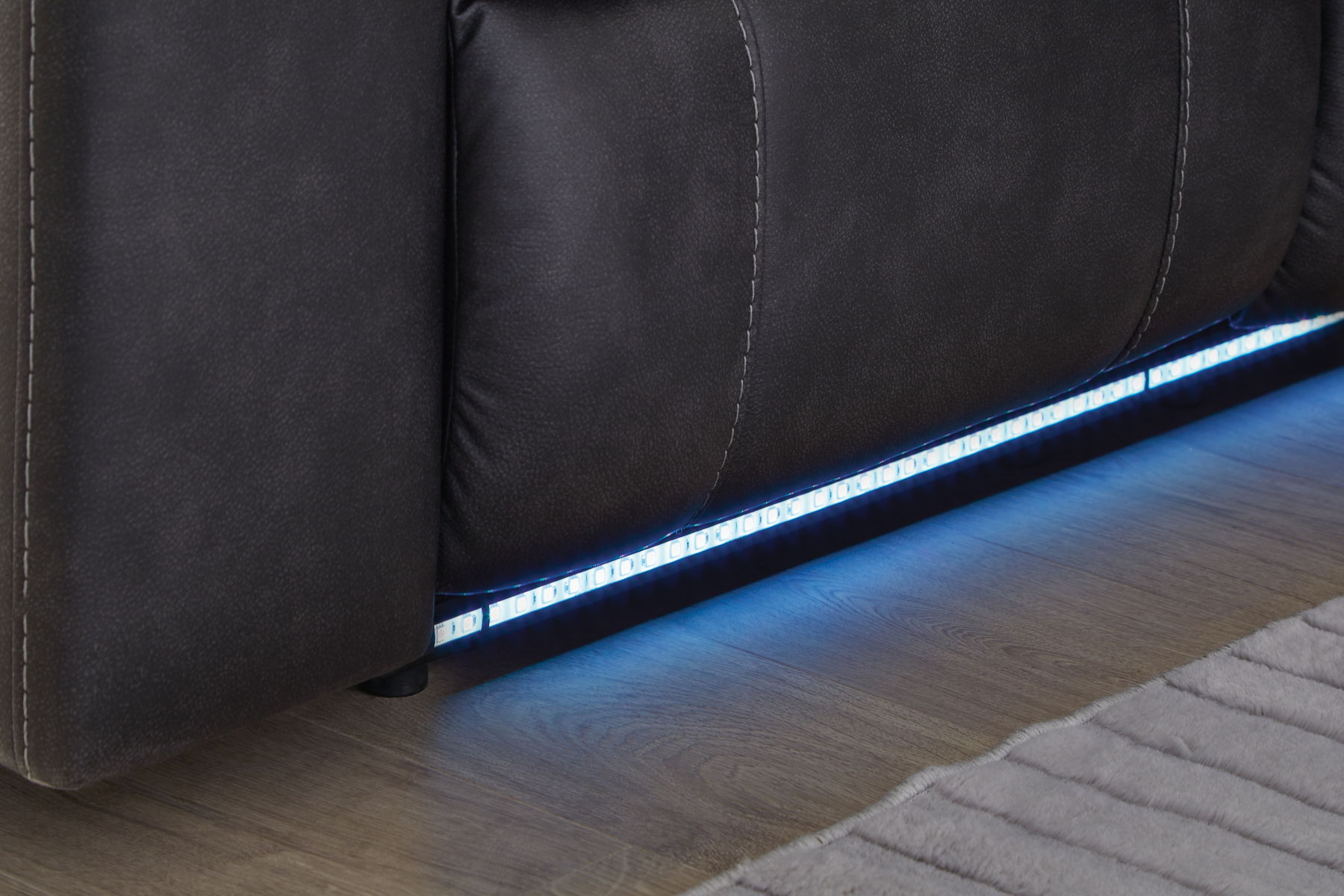 This reclining sectional pairs the luxe look of faux leather with must-have functional features. LED lights on the underside put a modern twist on the simply chic design—choose from three colors to add ambiance to movie night or gaming with friends. And you can keep remotes, drinks and other entertainment essentials close with the handy console. Ready to relax? Easy pull tab reclining has you stretched out in no time.