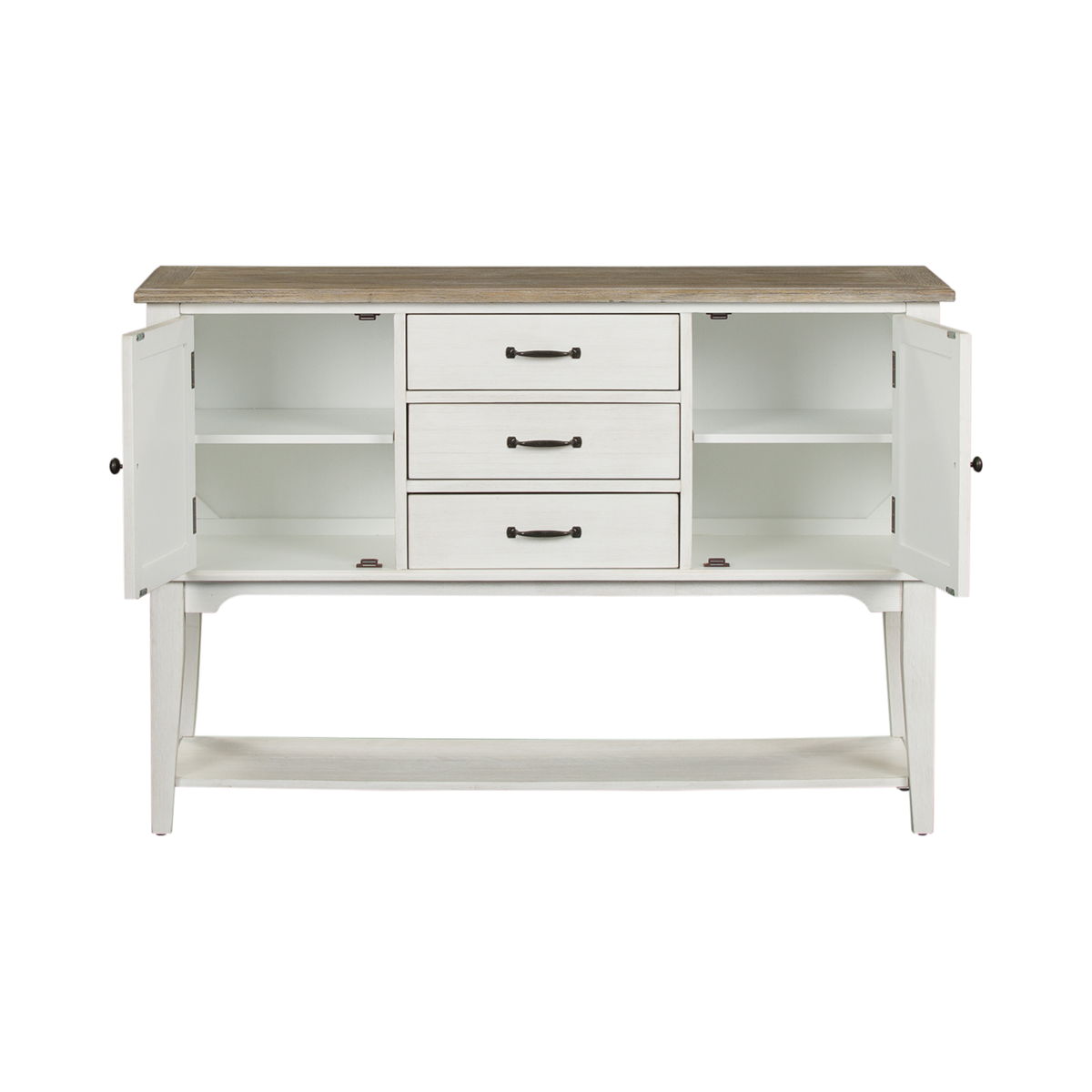 Summerville is a combination of style and function. The 48″ square table features a storage pedestal base with two shelves. Combine the table with modern sophisticated styled chairs with square backs upholstered in a white leather with button tufted accents and sloped arms