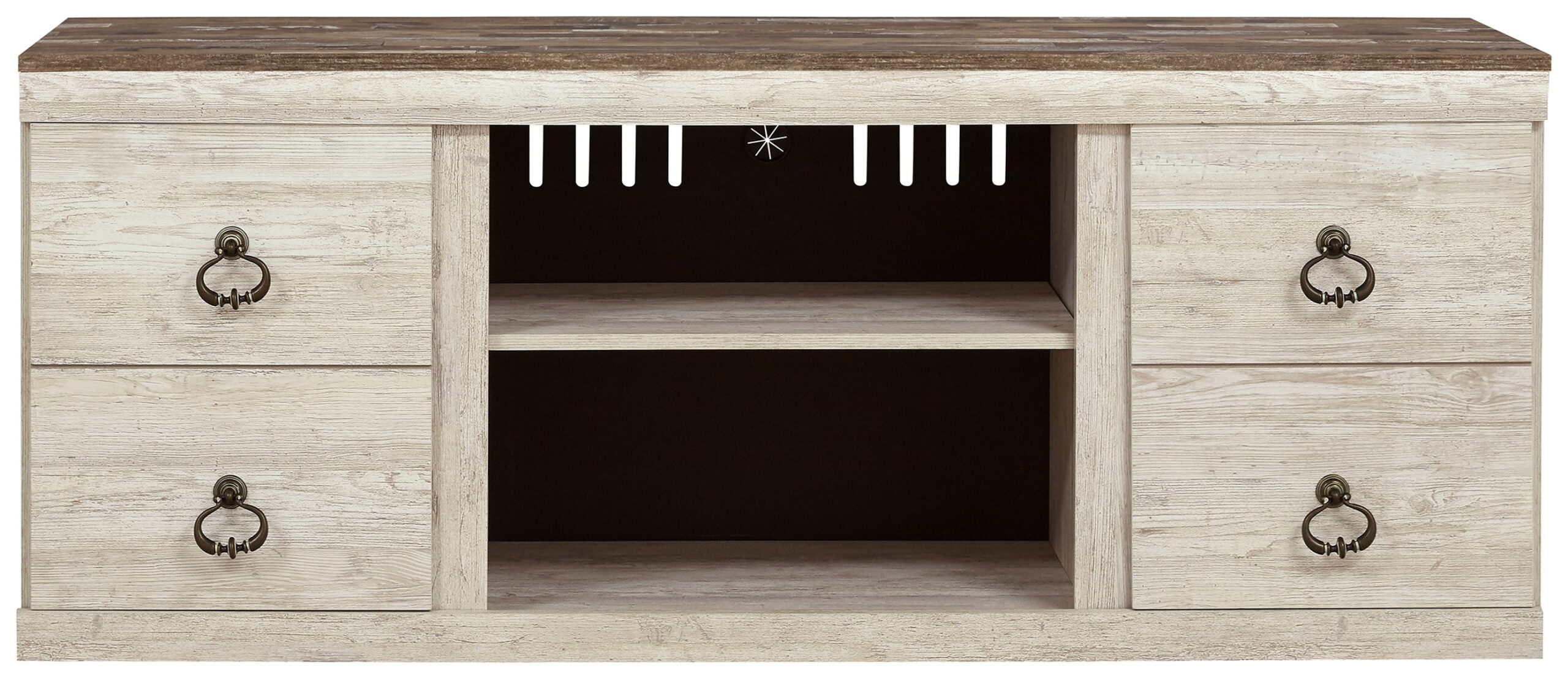 This TV stand with fireplace option is the ultimate statement piece for a coastal cottage or shabby chic inspired retreat. Whitewashed finish is wonderfully easy on the eyes. Paired with the TV stand´┐¢s unique plank-style top, it´s a driftwoody look that has our minds drifting away to beachy-keen escapes. Enhance the sense of homey warmth by removing the center shelf and making room for the electric fireplace insert, sold separately.