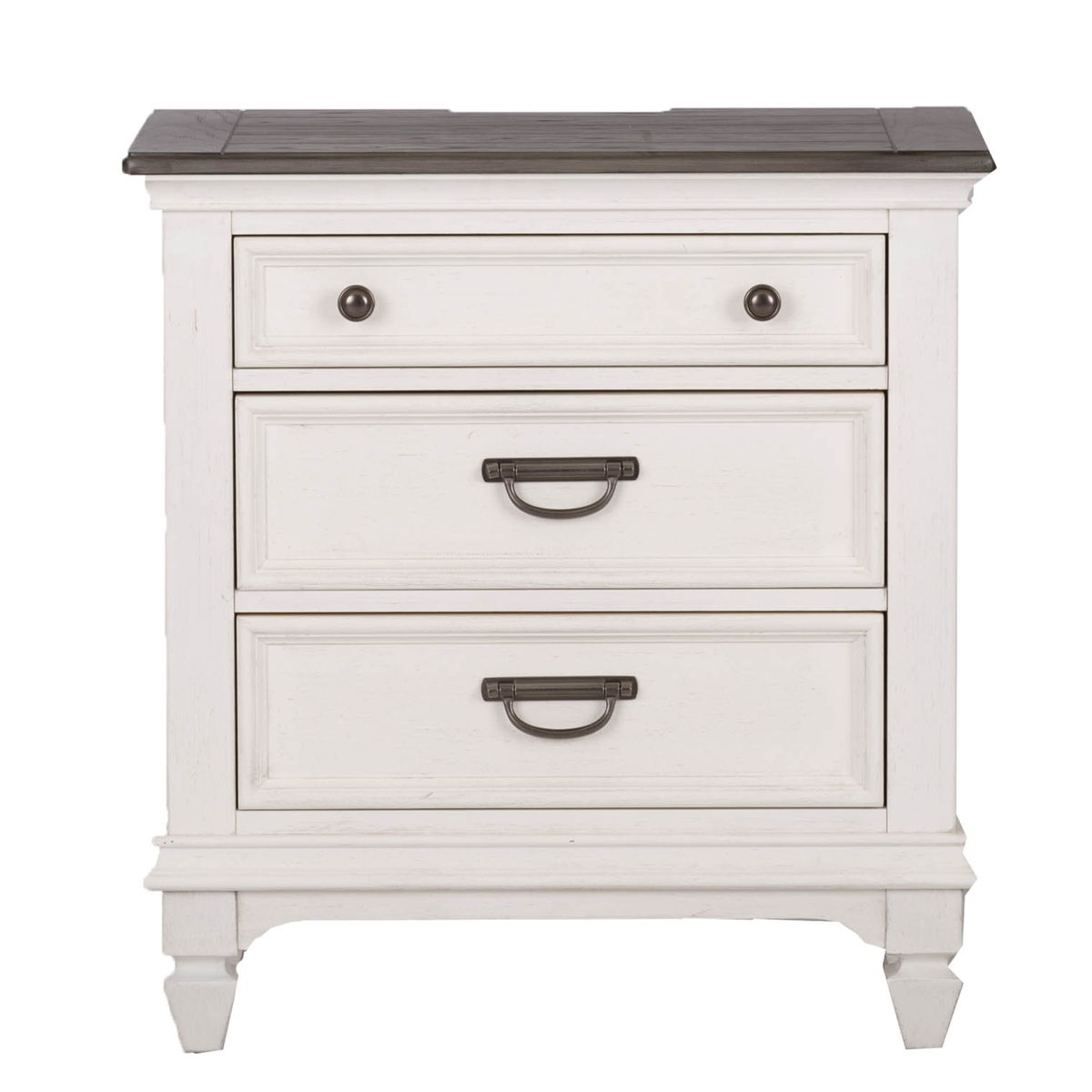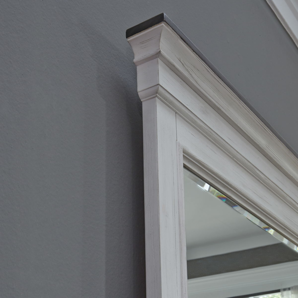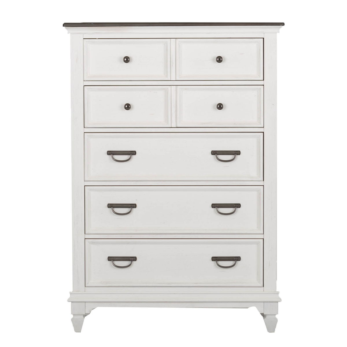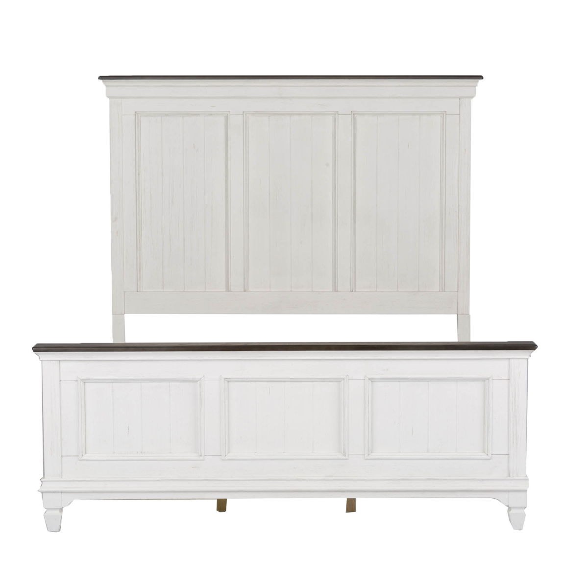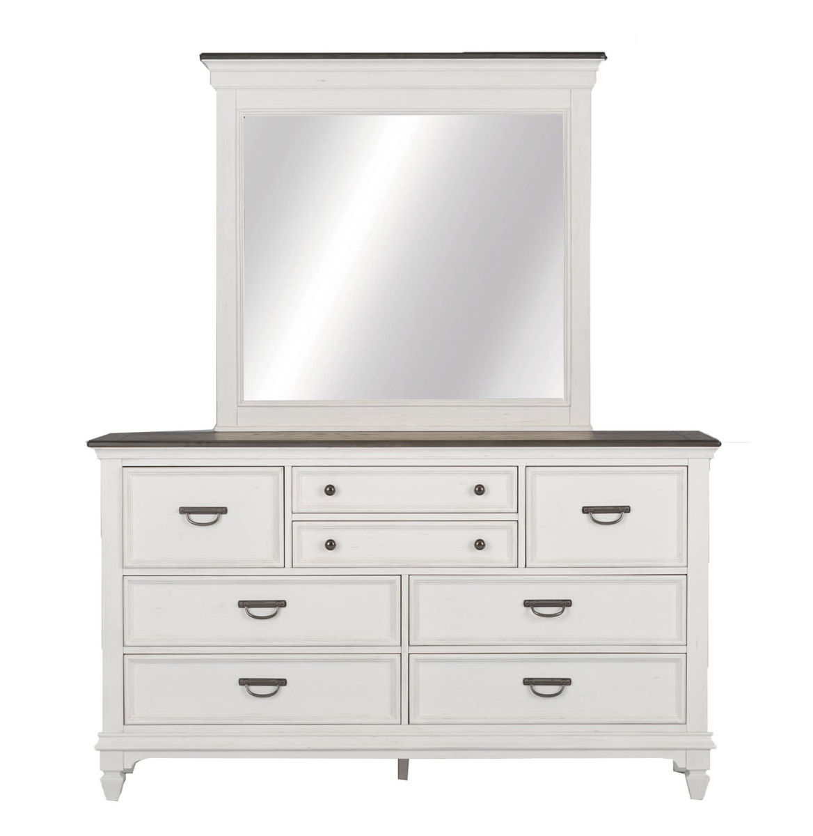 Bring beauty indoors with the Allyson Park panel bed, dresser, and mirror. Crafted of poplar and rubberwood solids with cathedral white oak tops, this kit features a wire brushed white finish with planked charcoal tops, bead molding, full extension drawers with felt lined top drawers, and is accented with antique pewter drop bail hardware. The panel bed features a planked headboard and footboard in a two-tone finish. The dresser has six drawers and pairs well with the crown mirror with its bead molding and beveled edge. Allyson Park offers cottage styles you love in a wire brushed two tone finish that will work from the beach to the mountains to an industrial loft.