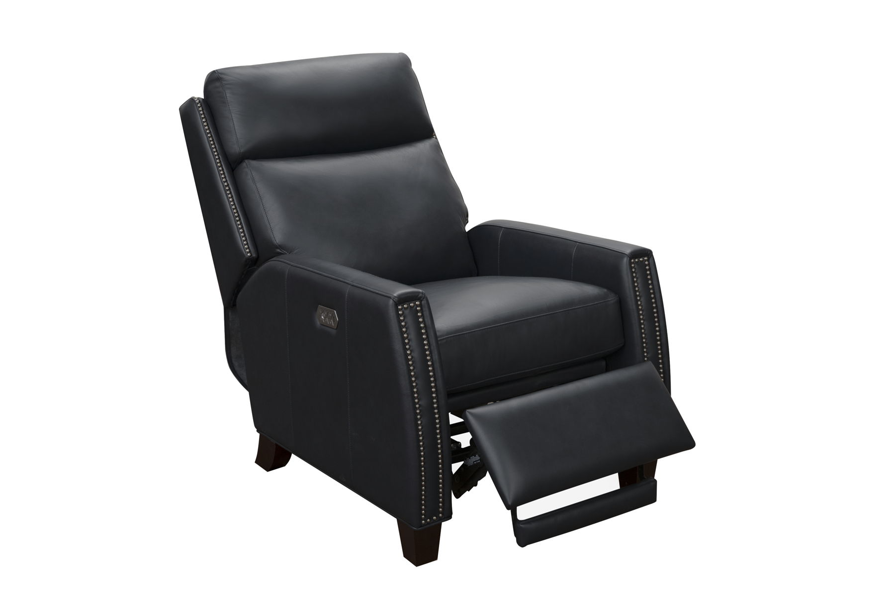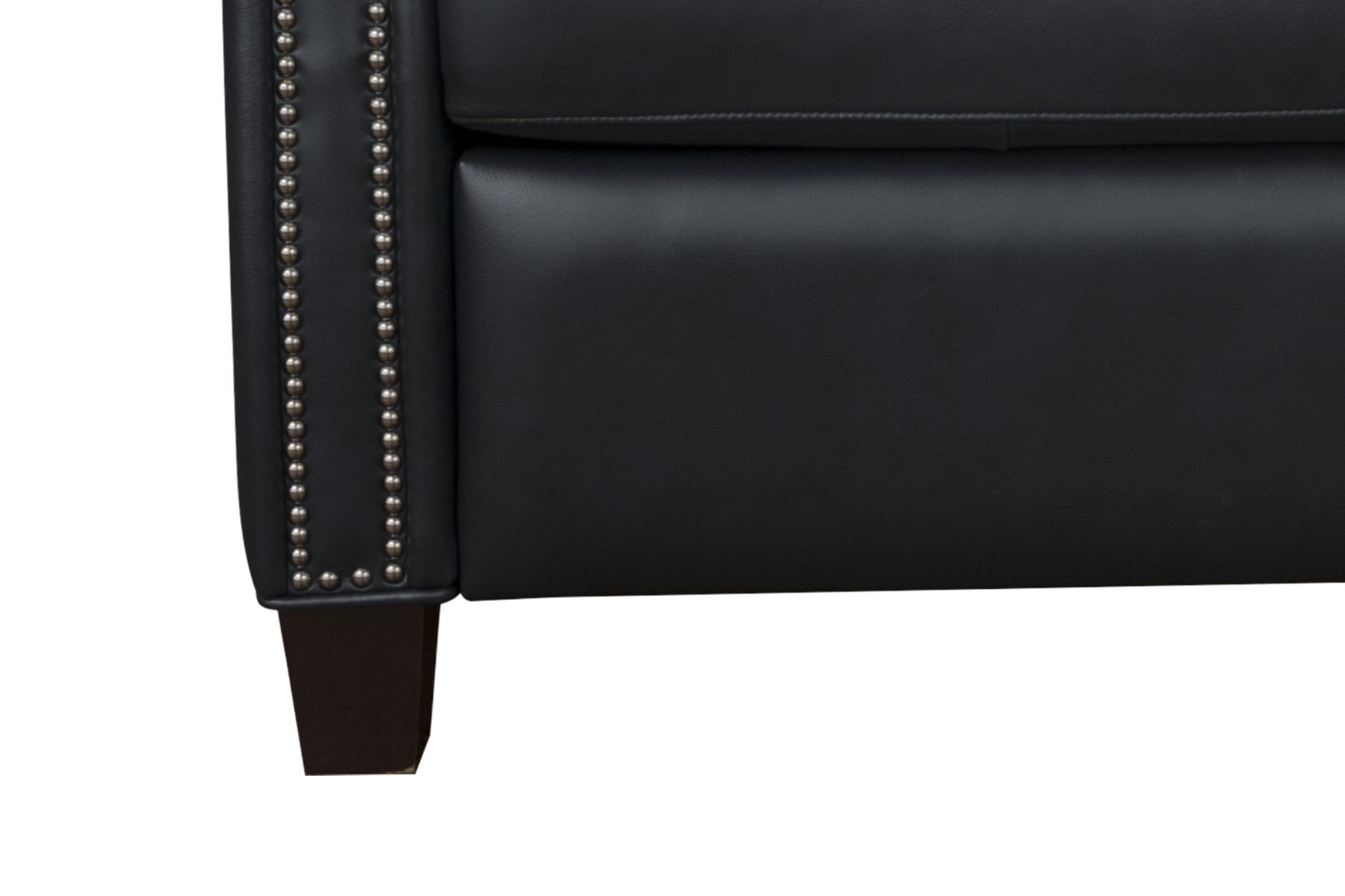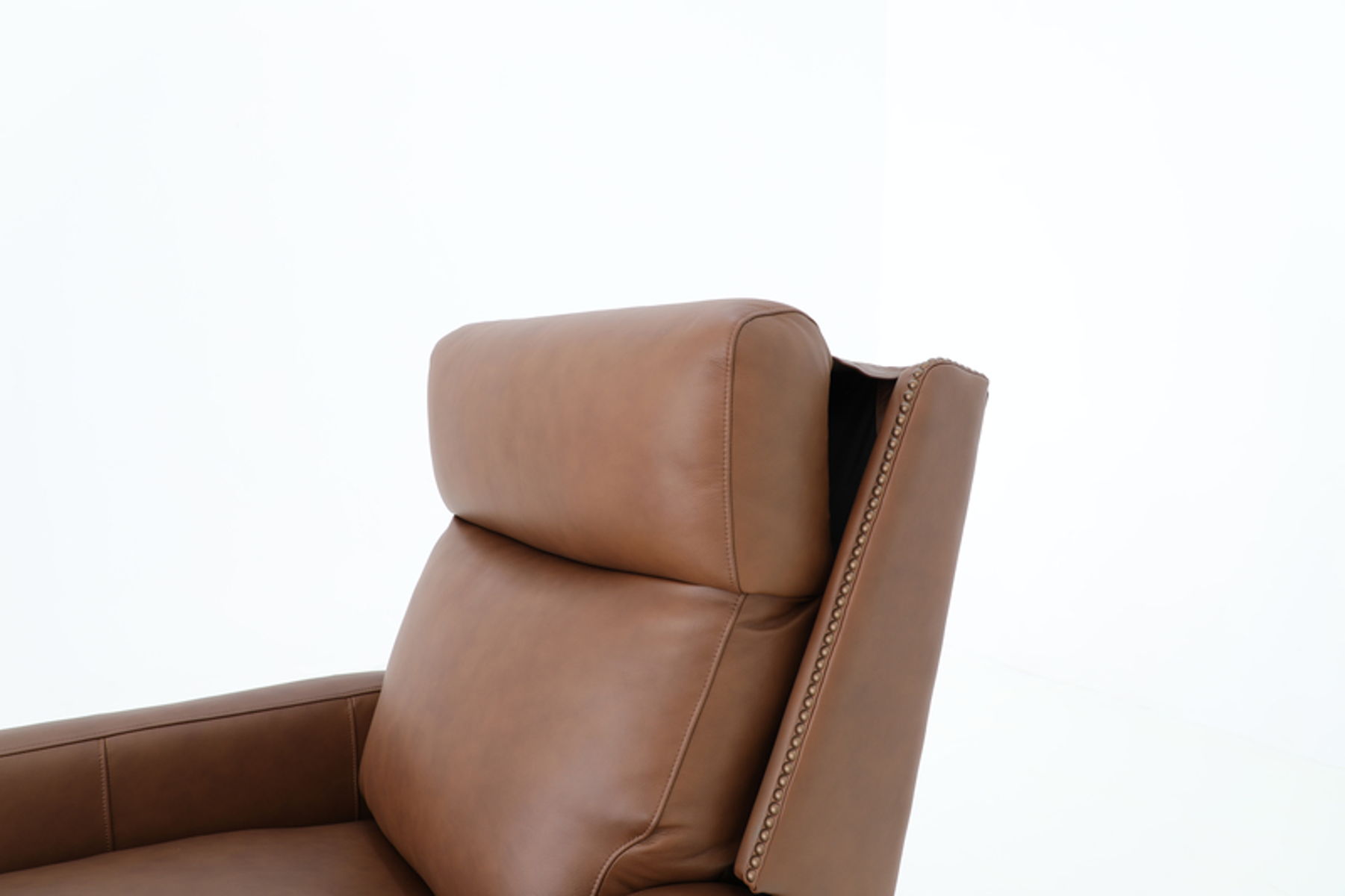 Triple Low Leg Recliner. 44.9” High Pub Back Design, Loose Welted Box Seat Cushion With Pocketed Coil Springs Encased In Foam, Wrapped In Dacron With A Feather Blend Topper, Footrest Extension, Nail Head Trim Accents, And Tapered Wood Legs Finished In A Warm Finish.