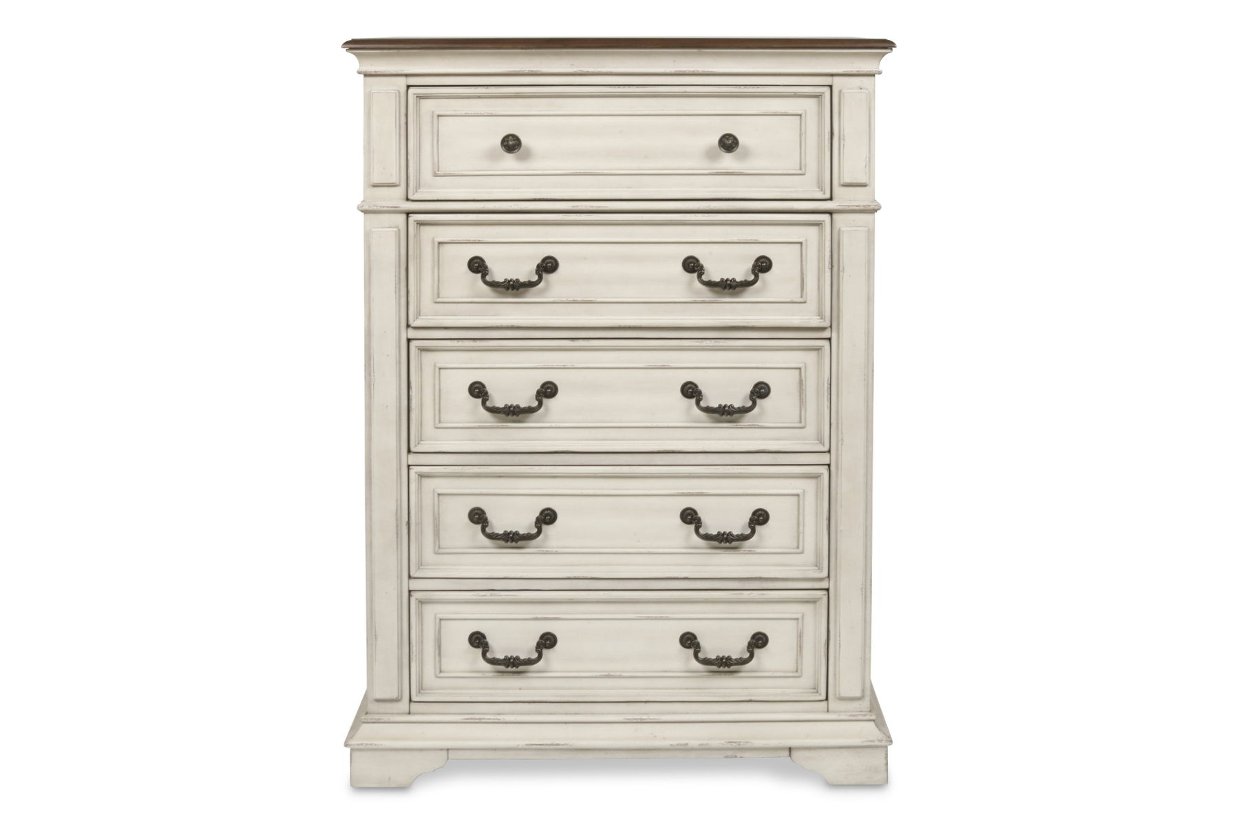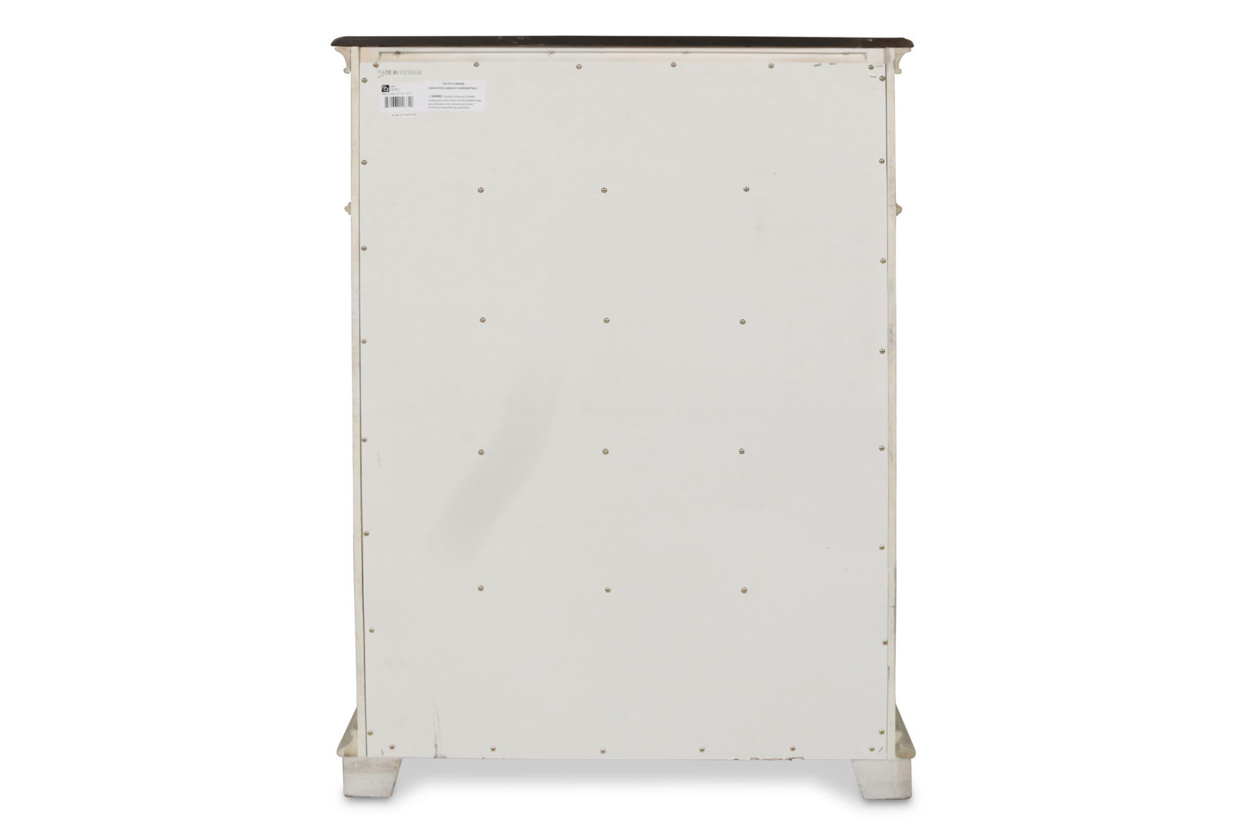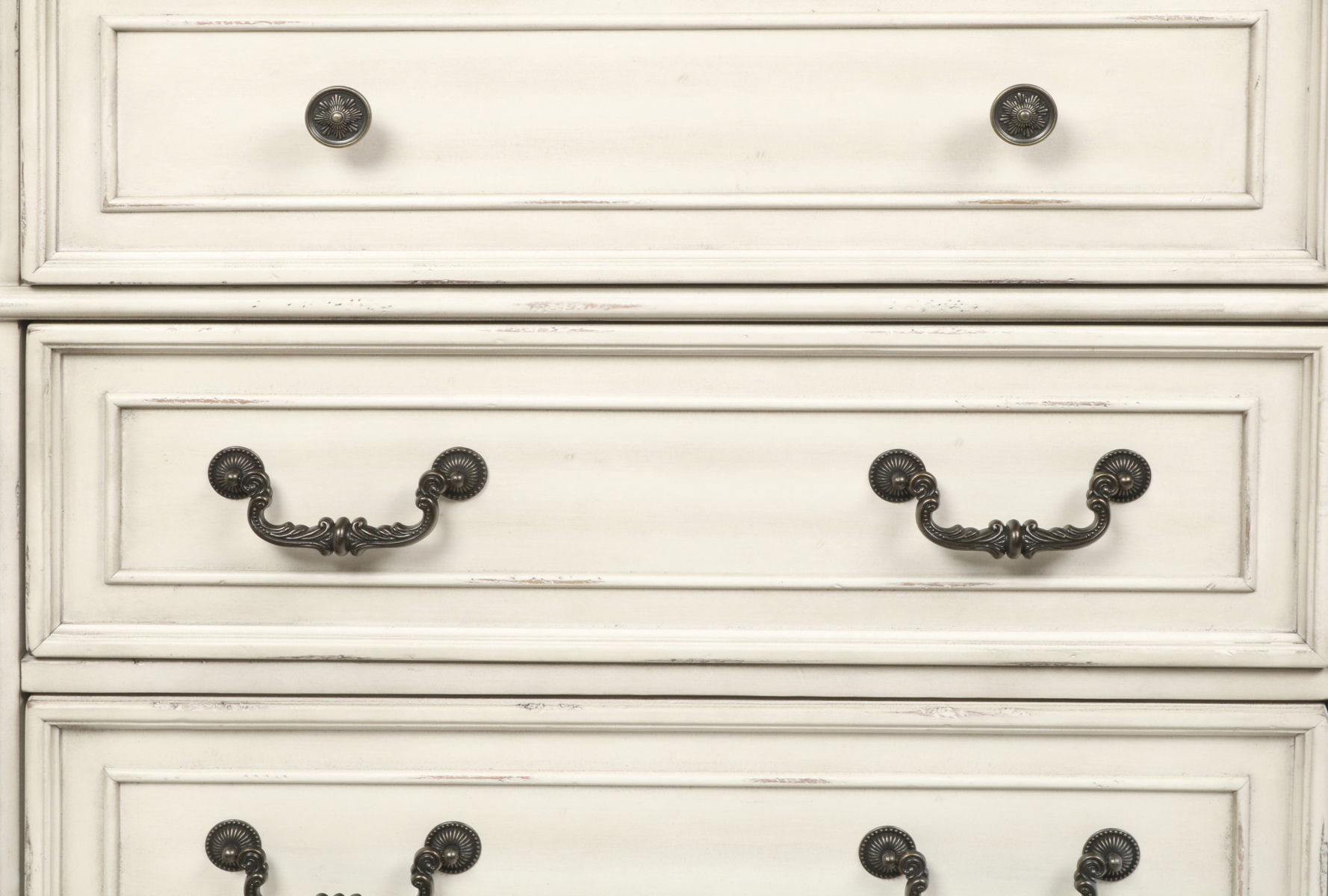 Complete your bedroom ensemble with the New Classic Furniture Anastasia 5 Drawer Chest in Antique White, a testament to real wood craftsmanship with solid poplar and oak veneer for enduring durability. The heirloom finish, achieved through a meticulous multi-step process involving wire brushing, clefts, rasping, threading, and rub throughs, grants each chest an upscale, vintage look, ensuring that no two pieces are exactly alike. The creamy off-white stain, enriched with brown and gray burnishing, radiates vintage French country cottage charm, accentuated by a rustic brown finish top that encapsulates the antique, old-world charm. The chest’s graceful composition is defined by picture frame drawer fronts, bracket feet, detailed crown molding aprons, and chamfered panel appliques, complemented by antique gold drop ball drawer pulls. Drawer operation is effortless with ball-bearing glides, providing a smooth and easy open performance. Enjoy clean and carefree storage with all drawers sanded and sealed, and top drawers lined with felt to safeguard delicates, watches, jewelry, and glasses. The bottom drawers are cedar-lined, offering a cozy haven for sweater storage. The time-tested quality is evident in the four-corner English dovetail joinery, ensuring a strong and durable piece of furniture.