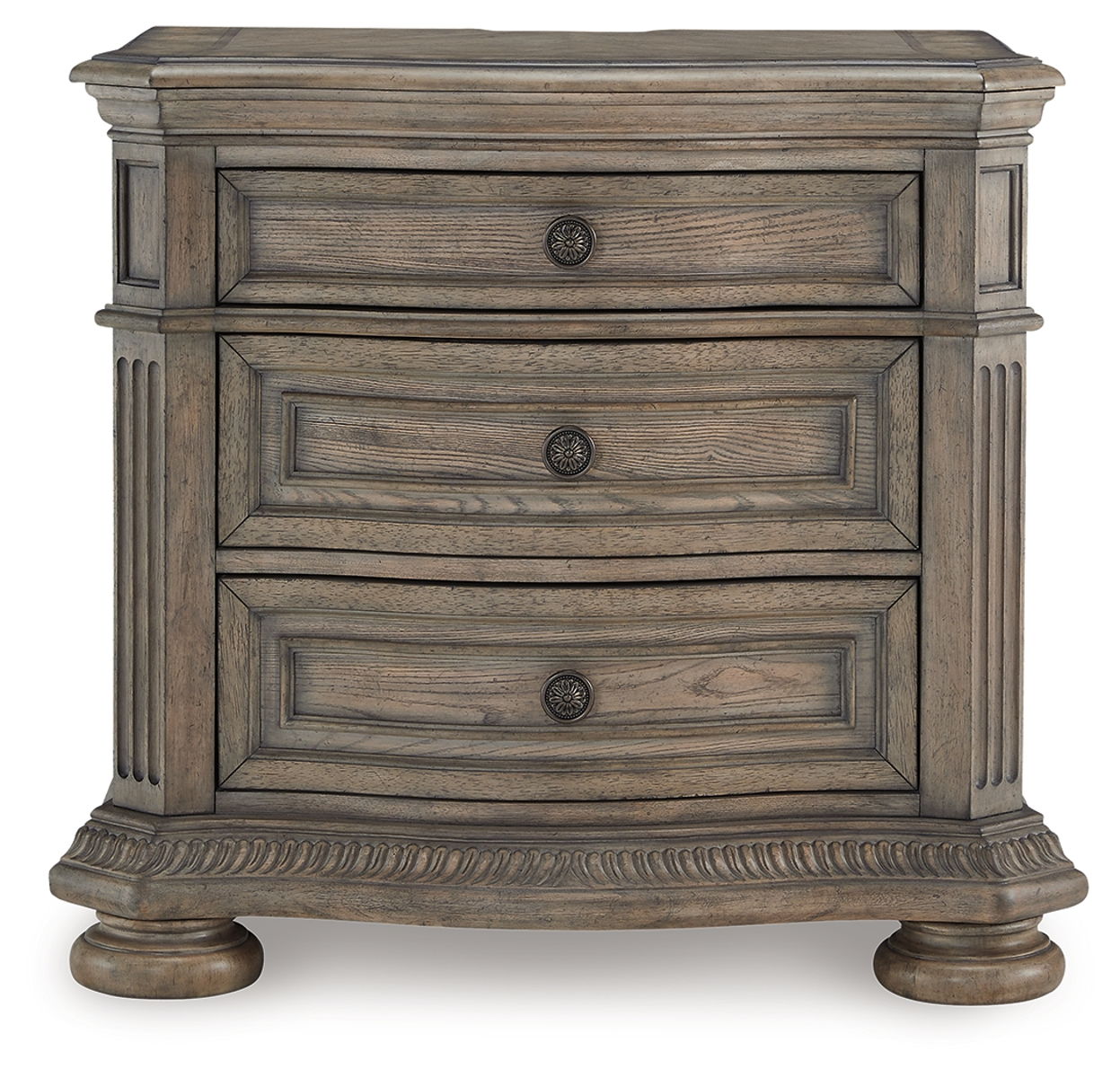 Merging traditional elegance with contemporary comfort, this nightstand takes your bedroom retreat to the next level. Serpentine curves, ash swirl veneer inlays on the top and a glazed antiqued-look finish radiate timeless sophistication. Drawers are packed with ample bedside storage possibilities. A convenient 110V power supply and USB charging add a modern touch to this stunningly refined piece.