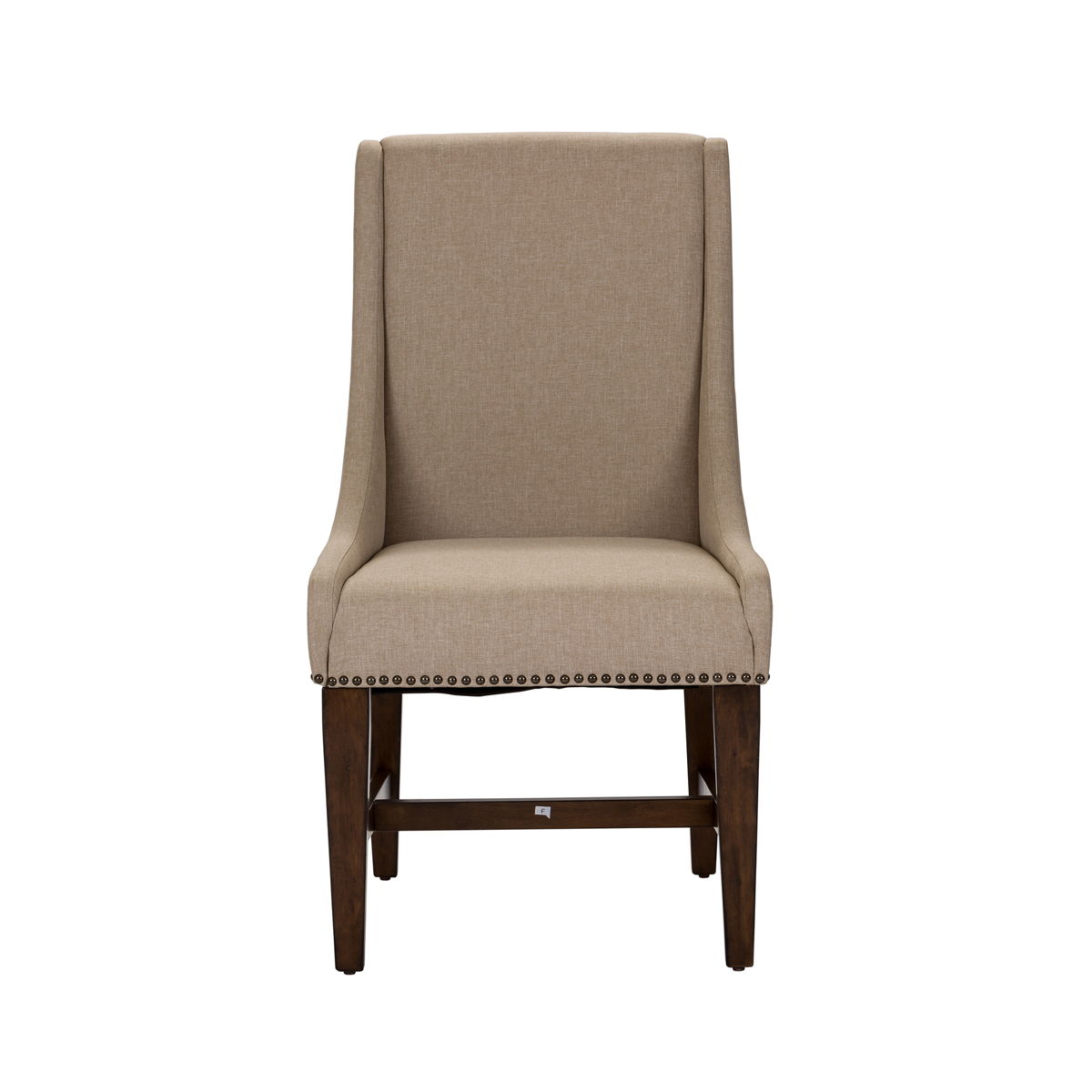 Armand, inspired by a 17 century French antique. Pulling in Tuscan elements for the dining the rectangular trestle table features heavy square turned bases. Square back, armless upholstered chairs feature linen upholstery with a nail head trim on the base of the chair. The buffet features 4 door panels with overlays and pilasters chamfered for a soft appeal. Cases feature overlays on the top drawers, framed drawer panels, block feet and chamfered posts. Media features drop down fronts so it can double as a small dresser with the landscape mirror for smaller spaces.