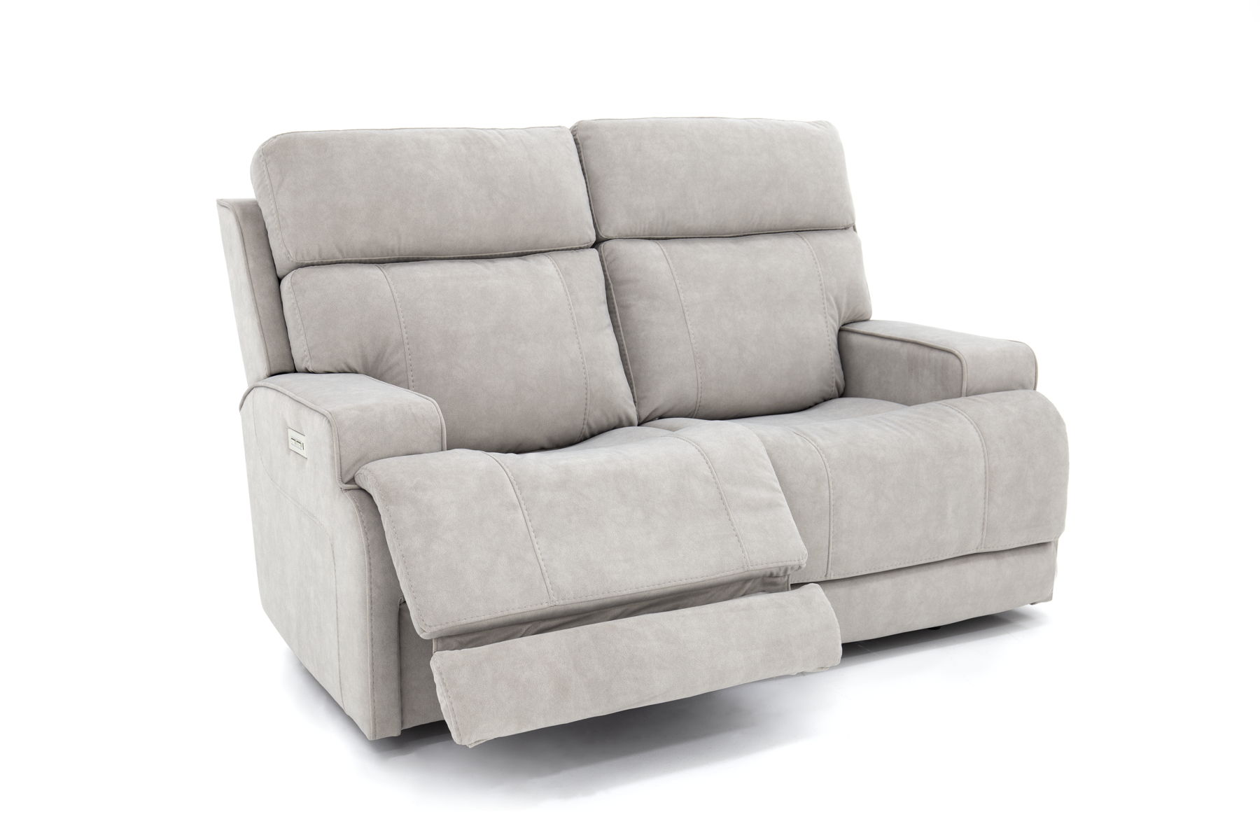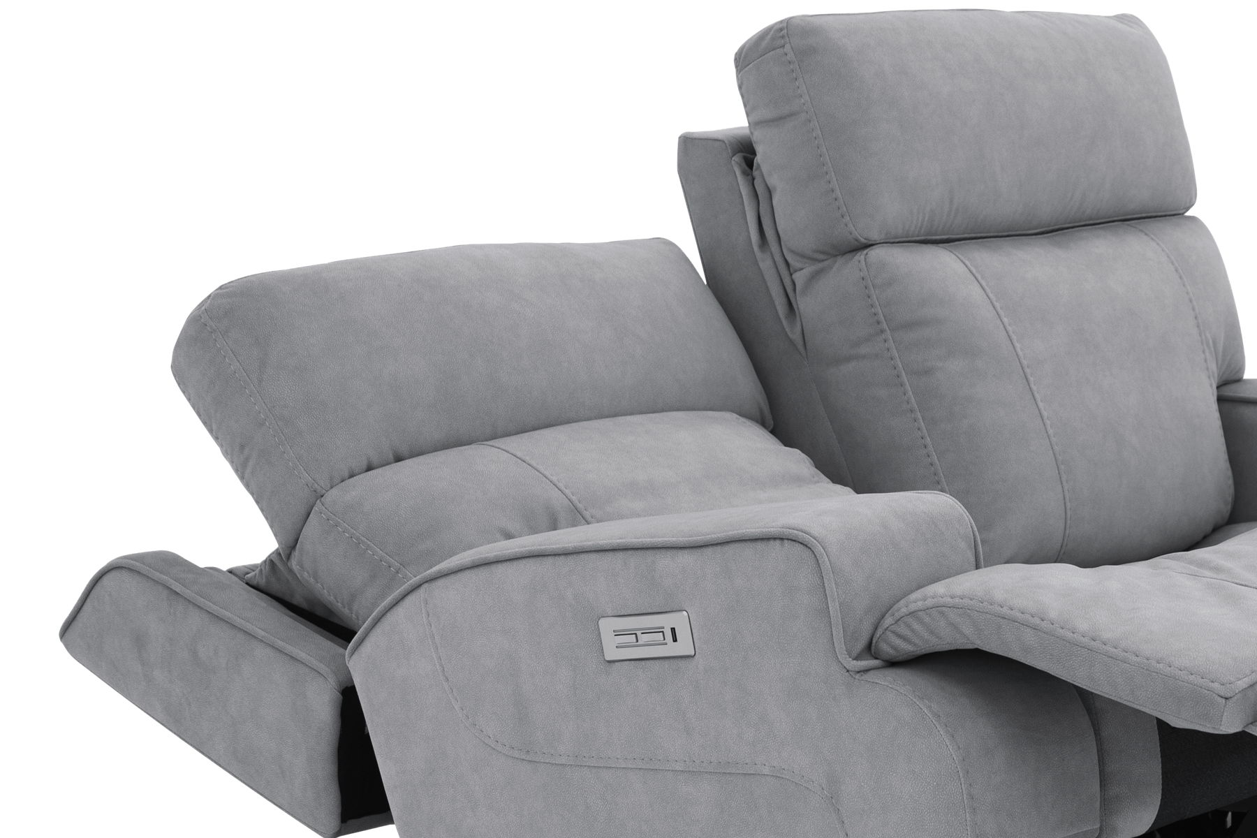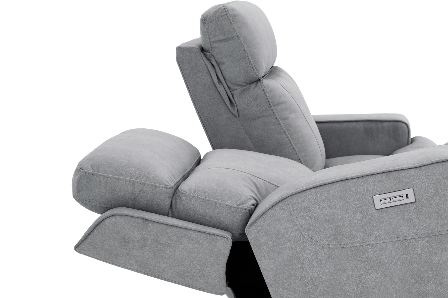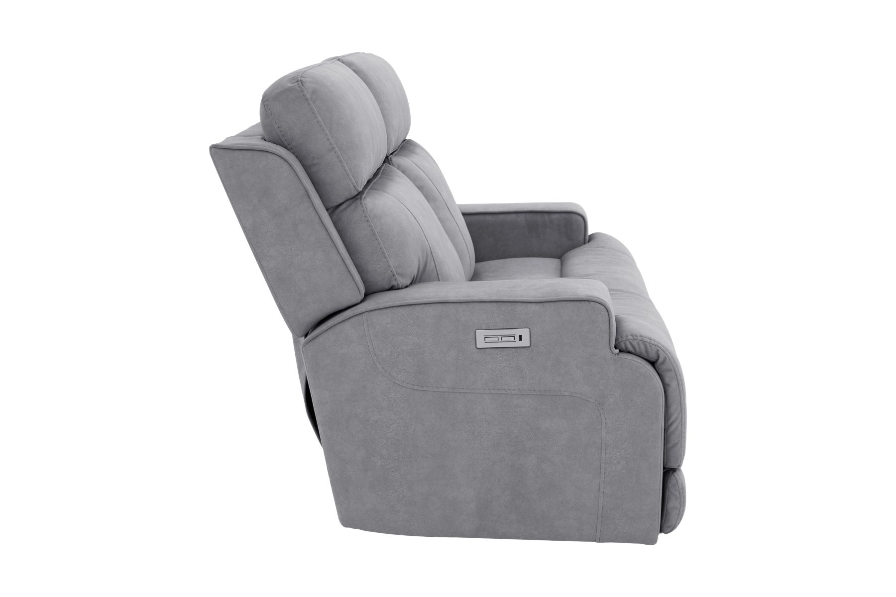 Contemporary Zero Gravity reclining sofa group. Features 89.5” power reclining sofa with zero gravity mechanism, steel seat box, power headrest, 3” footrest extension, side control panel with all close button and USB port. The group has bucketed pad over chaise pocketed coil seating, 42.5” high split pub back with power headrest, and plush welted track arms. Matching loveseat and recliner available. Only offered in fabric.