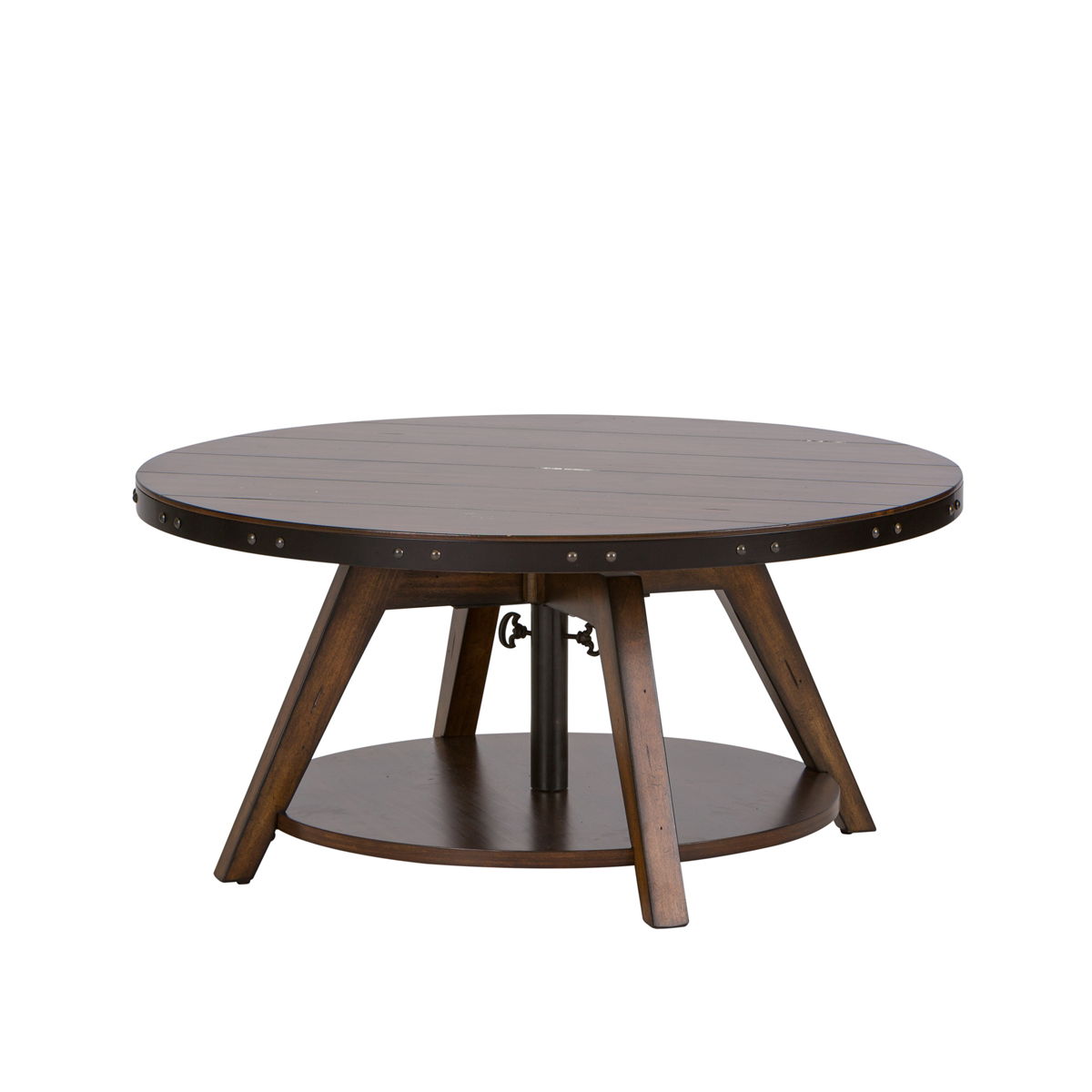 Enhance your space with the traditional Aspen Skies motion cocktail table. Crafted of pine solids and New Zealand pine veneers with metal accents, this piece features a brown finish, appealing planked top, bottom shelf design for additional storage, metal accents with nail heads outlining the table top, and an adjustable tabletop extending from 16″ to 24″. A wonderful addition to any rustic style space.