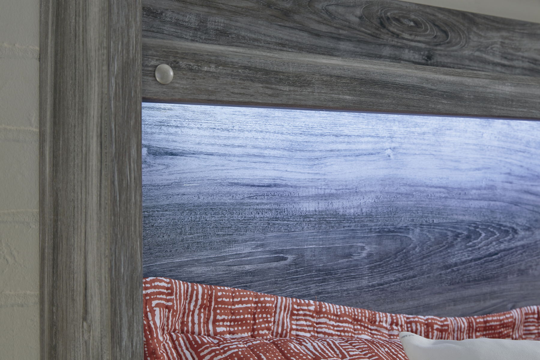 Rest in the casually cool style of this panel headboard. A weathered finish and chill LED lighting create an easygoing vibe, setting the scene in your restful retreat. Its clean-lined design provides a fuss-free look.