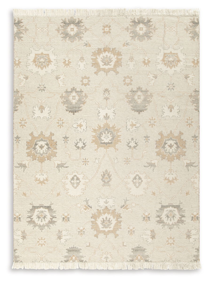 Bring modern life into balance with the rhythms and beauty of nature. This area rug has the vintage look of an heirloom. Blooming with graceful florals in neutral tones and surrounded by fringe edging, it adds style to any lounge space.