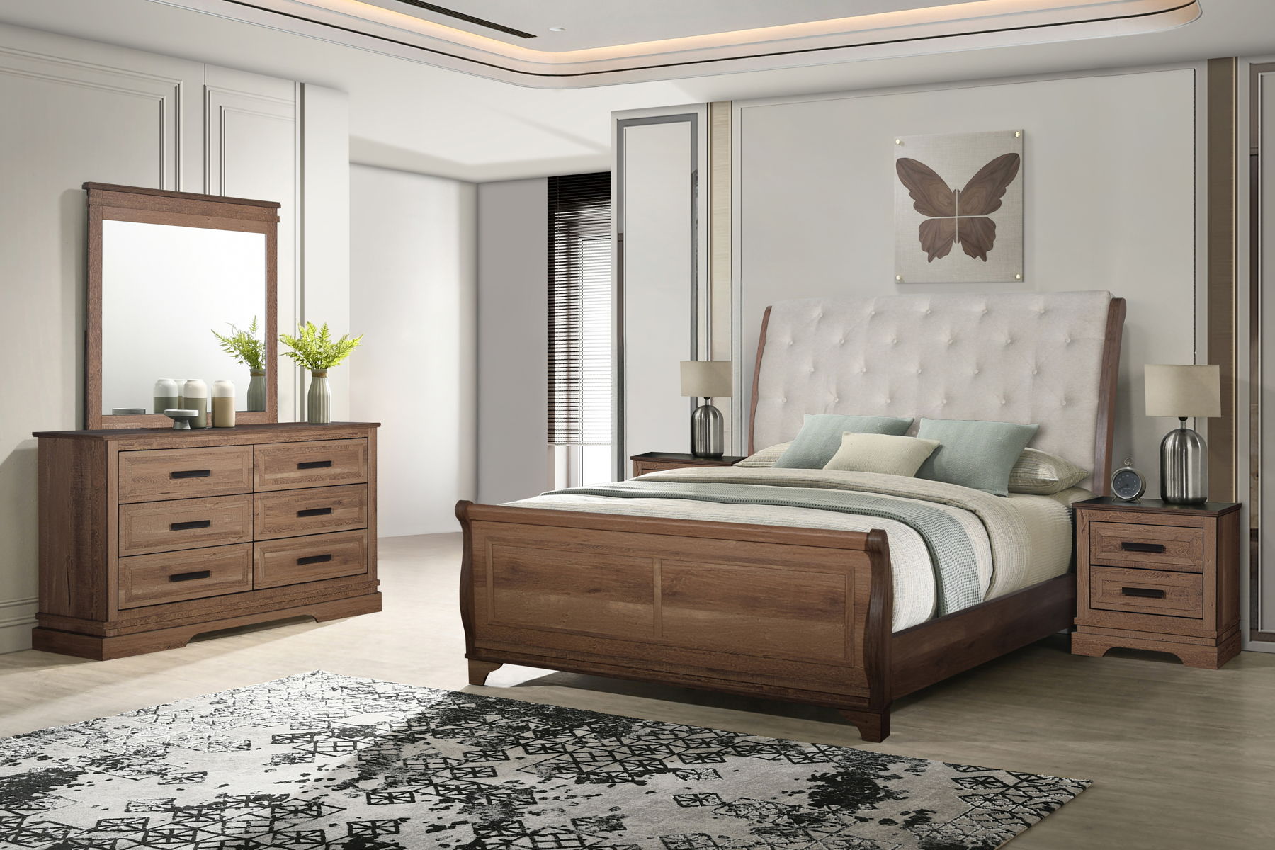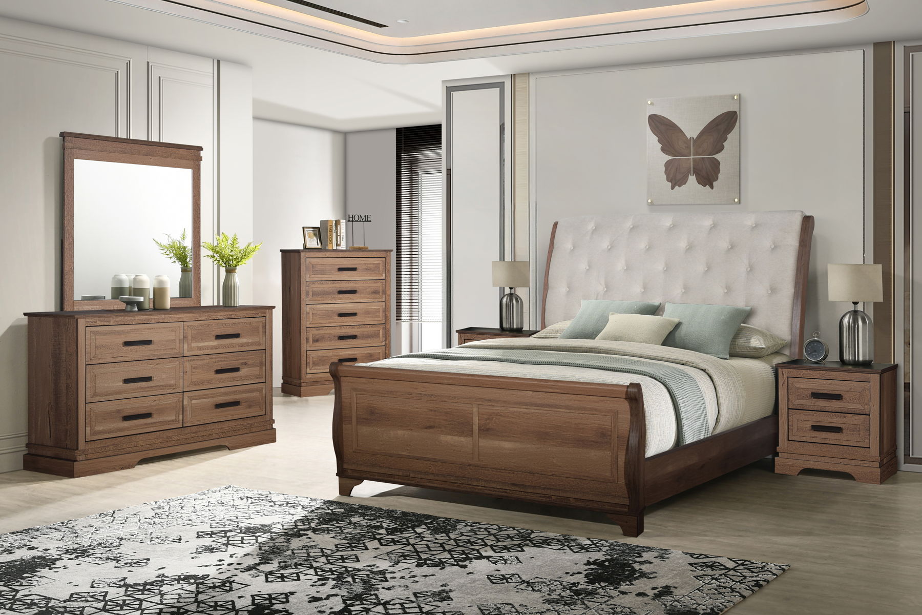 The Coventry Hall Bedroom Set is a testament to both durability and style. This set includes an Upholstered Sleigh Bed, a Dresser, a Mirror, and a Chest, each crafted with meticulous attention to detail. Constructed from manufactured woods and topped with eco-friendly decorative laminate, the bed promises strength and stability while resisting scratches, stains, and moisture. Its modern rustic design blends the warmth of natural wood textures with clean, contemporary lines, featuring picture frame moldings, bracket feet, and contrasting hardware. The plush, button-tufted headboard, upholstered in 100% polyester, offers a luxurious lounging experience. Both the 6-drawer dresser and 5-drawer chest provide ample storage space, with drawers built using durable dovetail joinery and smooth ball bearing glides for effortless operation. This versatile set not only enhances the aesthetics of any bedroom but also offers practical functionality and lasting quality. Experience a blend of modern design and rustic charm that makes your bedroom both beautiful and organized.