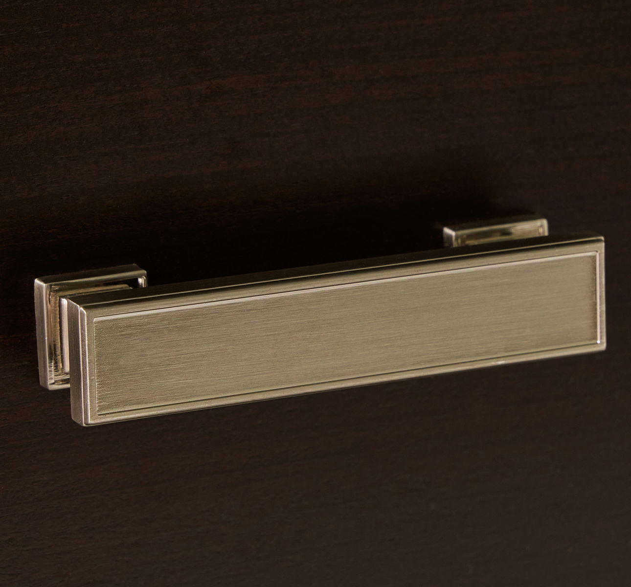 - Metal bar pulls with bright nickel-tone finish