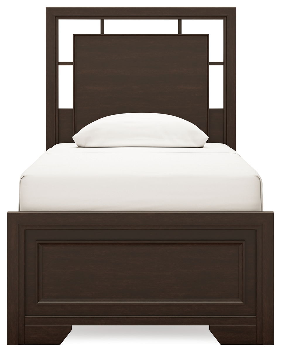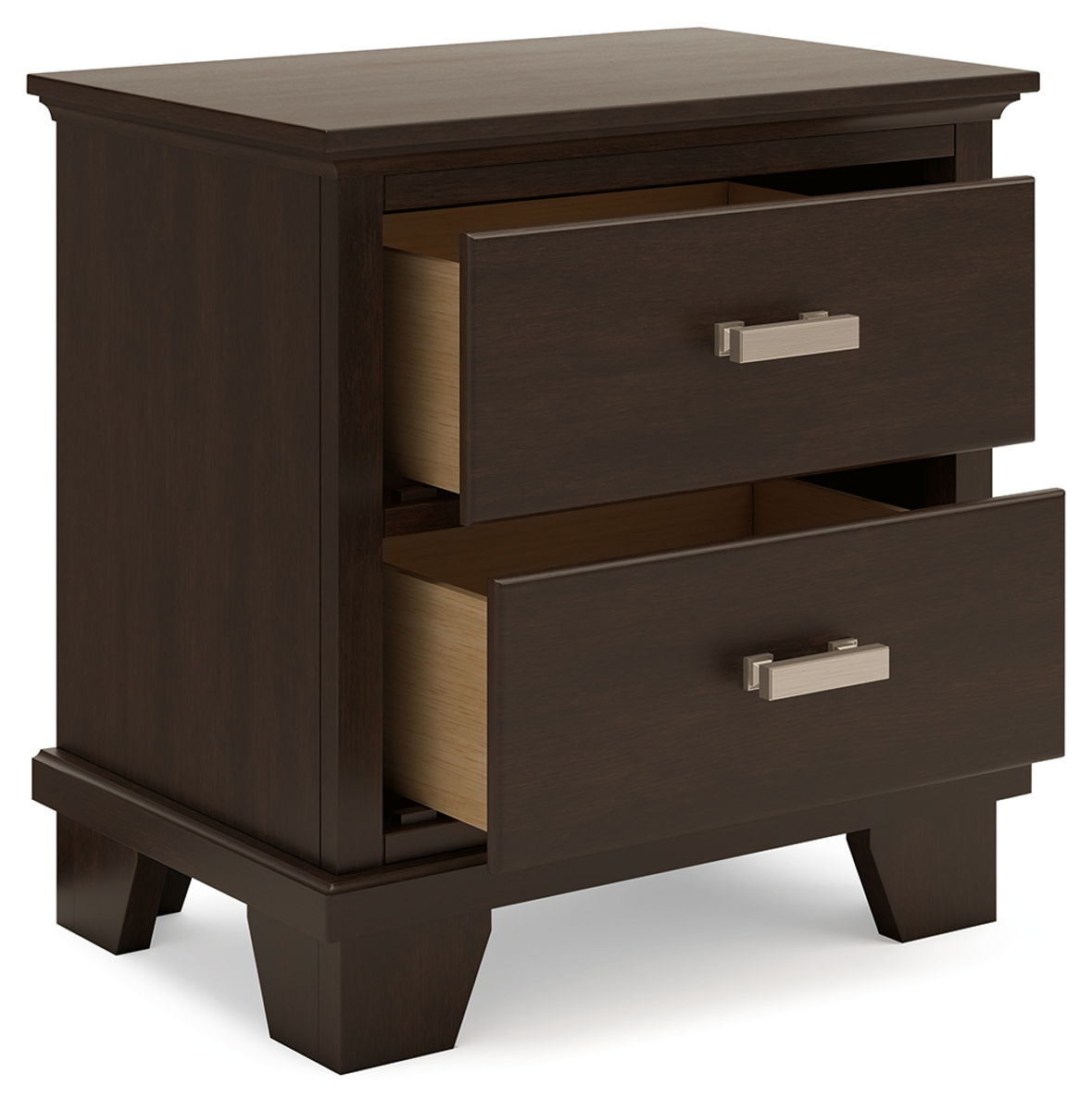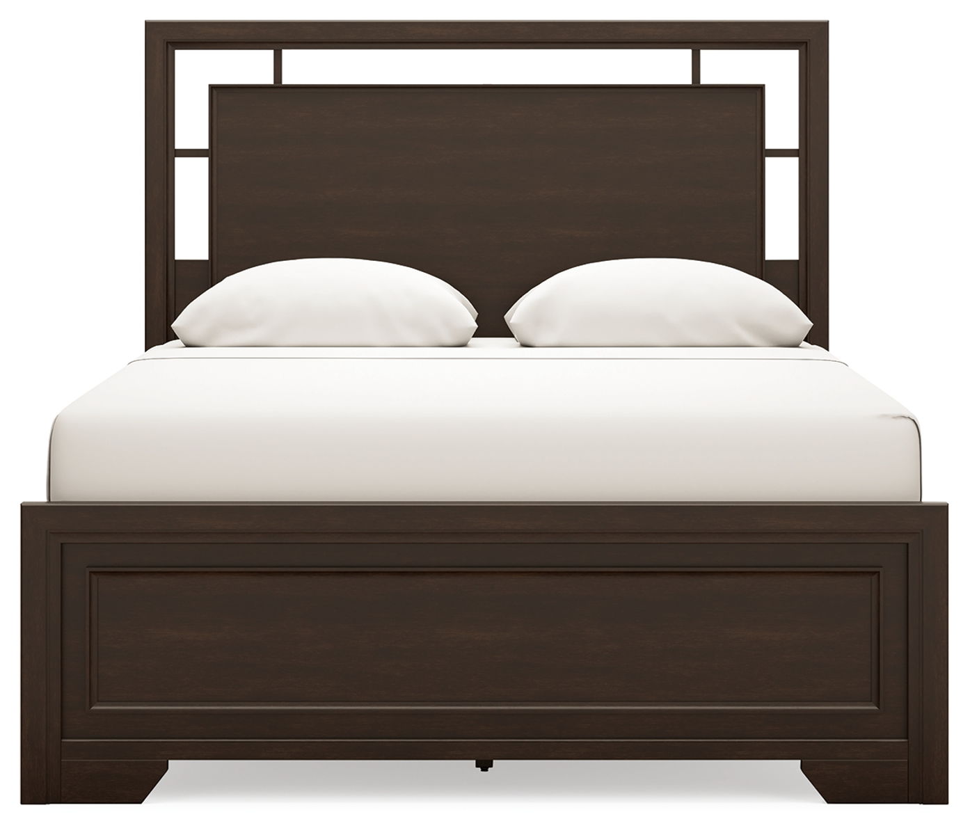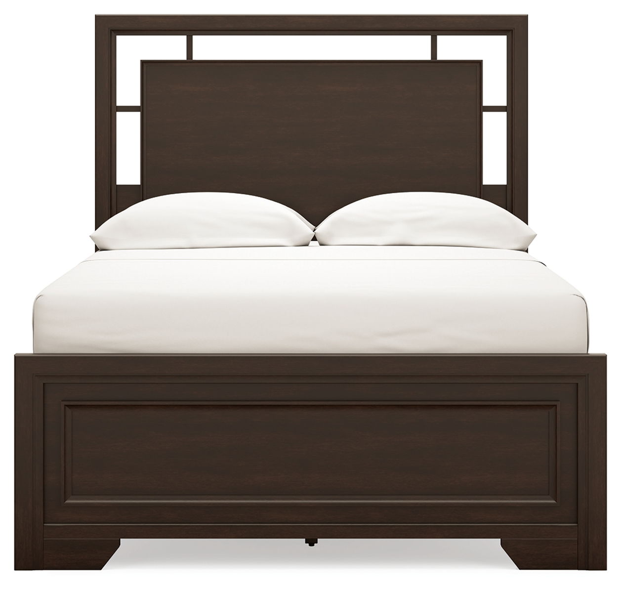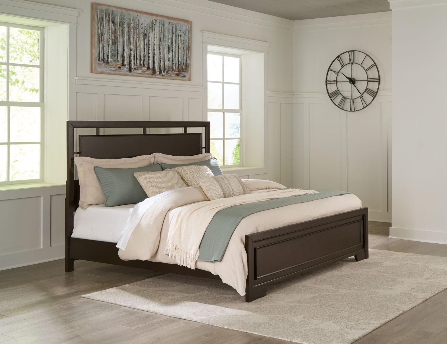 Transitional design. Made with hardwood solids, wood veneer, and MDF substrates. Transitional styled cases with a Metropolitan flare. Drawers feature English dovetail construction, a clean wood grain laminate interior and metal center guides. Metal bar pulls with a bright nickel color finish. Panel bed features a floating headboard panel design with a stylish picture framed footboard. Such a refined way to wake up your bedroom style.