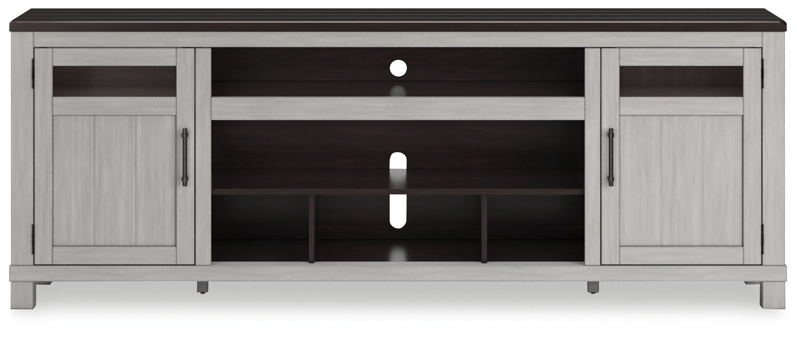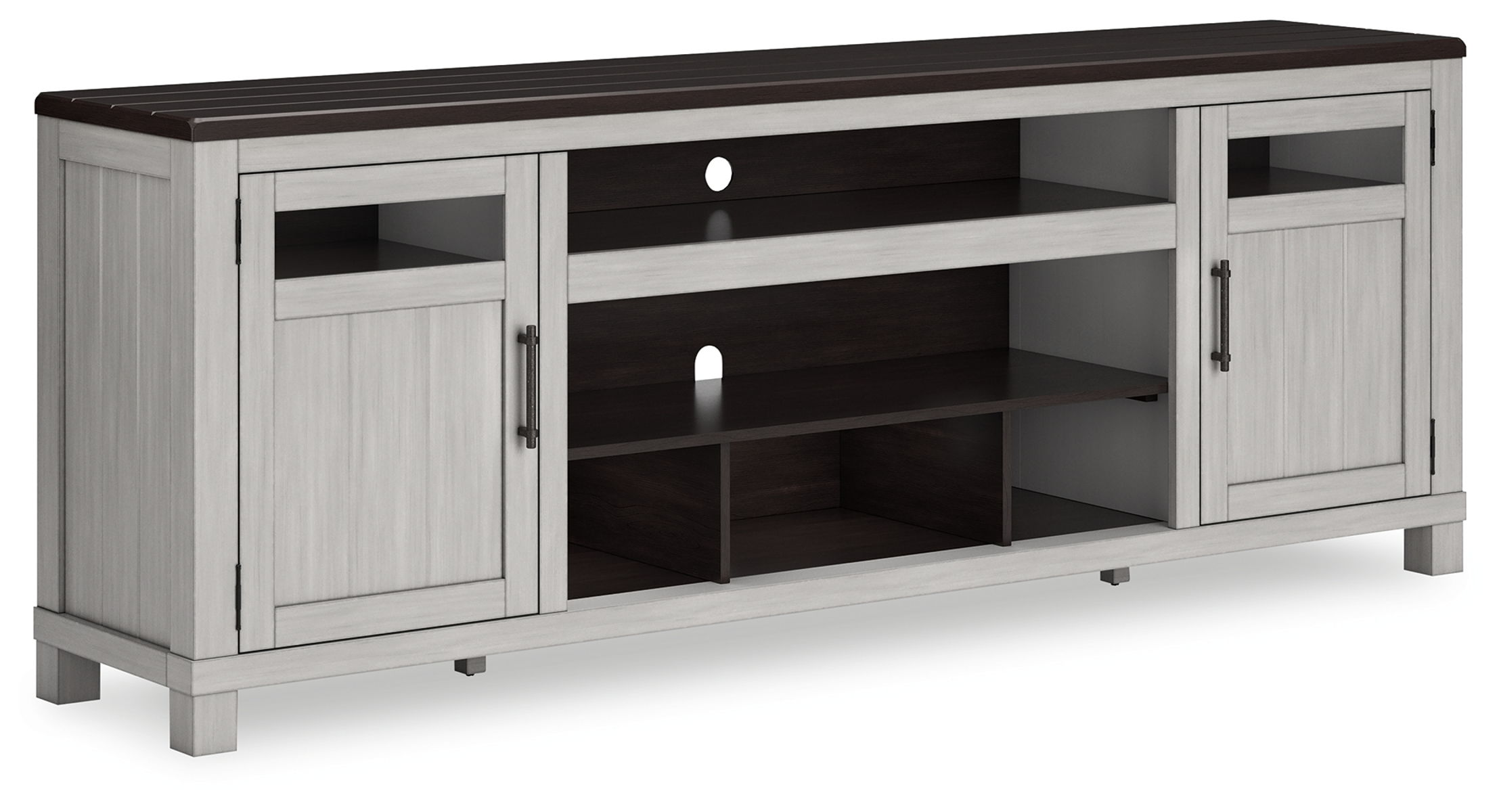 Make a farmhouse-inspired statement with this TV stand. It’s beautifully crafted to stand the test of time, with a planked effect and clean two-tone finish that lend a relaxing vintage feel. With two cabinets (each with an adjustable shelf) and an open cubby, it offers plenty of storage to house all of your electronic needs. Enhancing the experience: the optional fireplace insert (sold separately) brings a touch of warmth and beautiful ambiance to your living room.