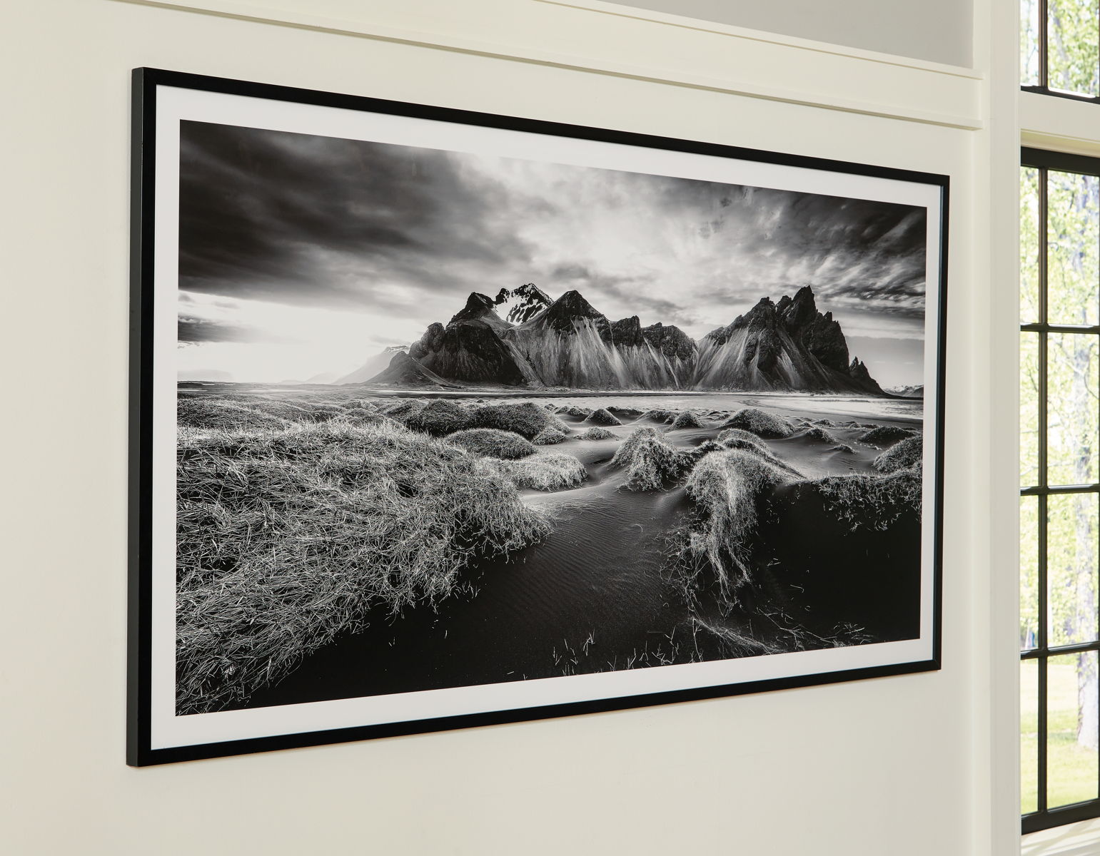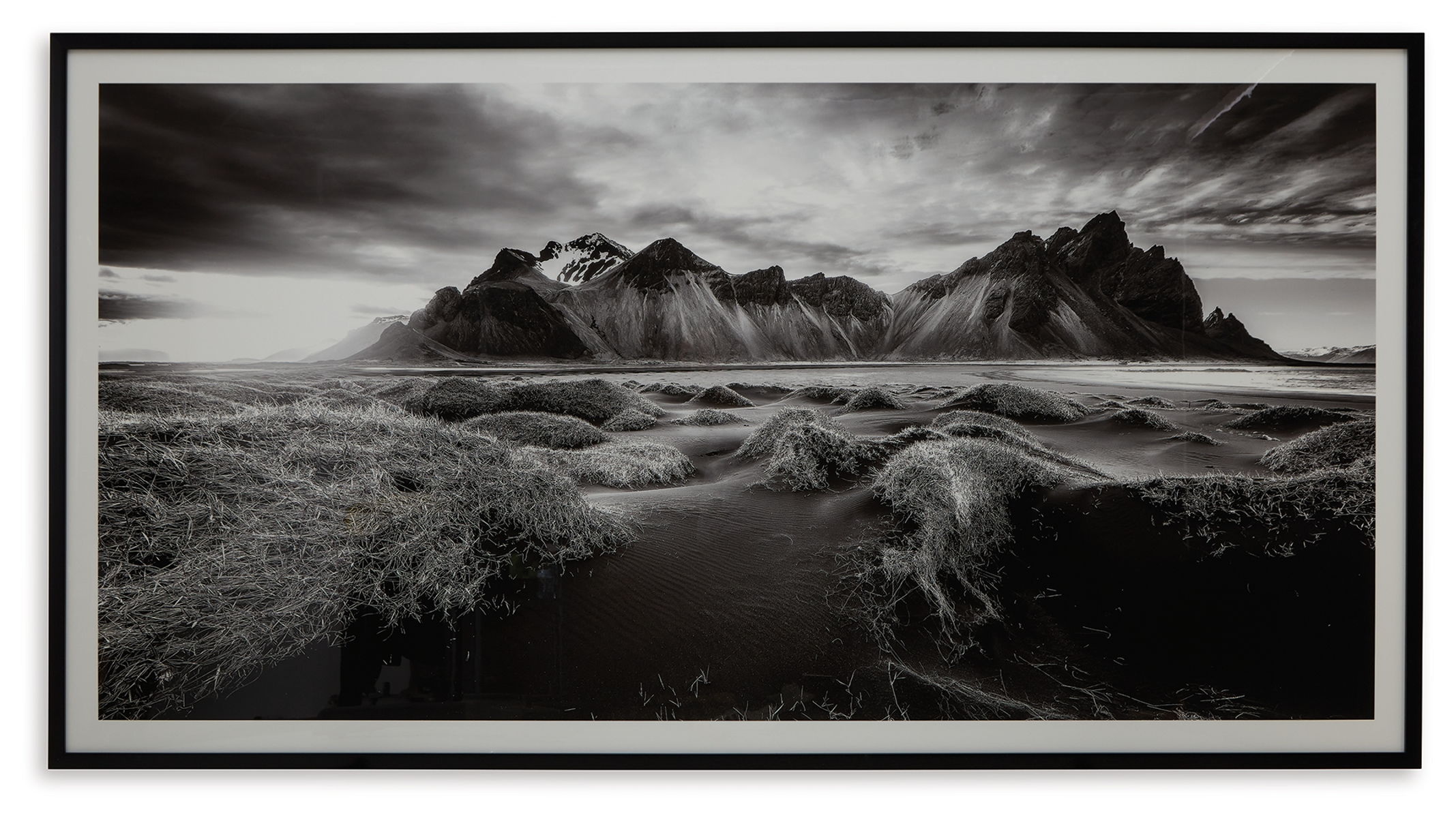 If you have your sights set on a striking landscape, this wall art is a natural wonder. Staggeringly beautiful, the framed black and white print showcases majestic mountains and a meandering stream. This moody and marvelous piece adds an air of dramatic beauty to your modern decor.