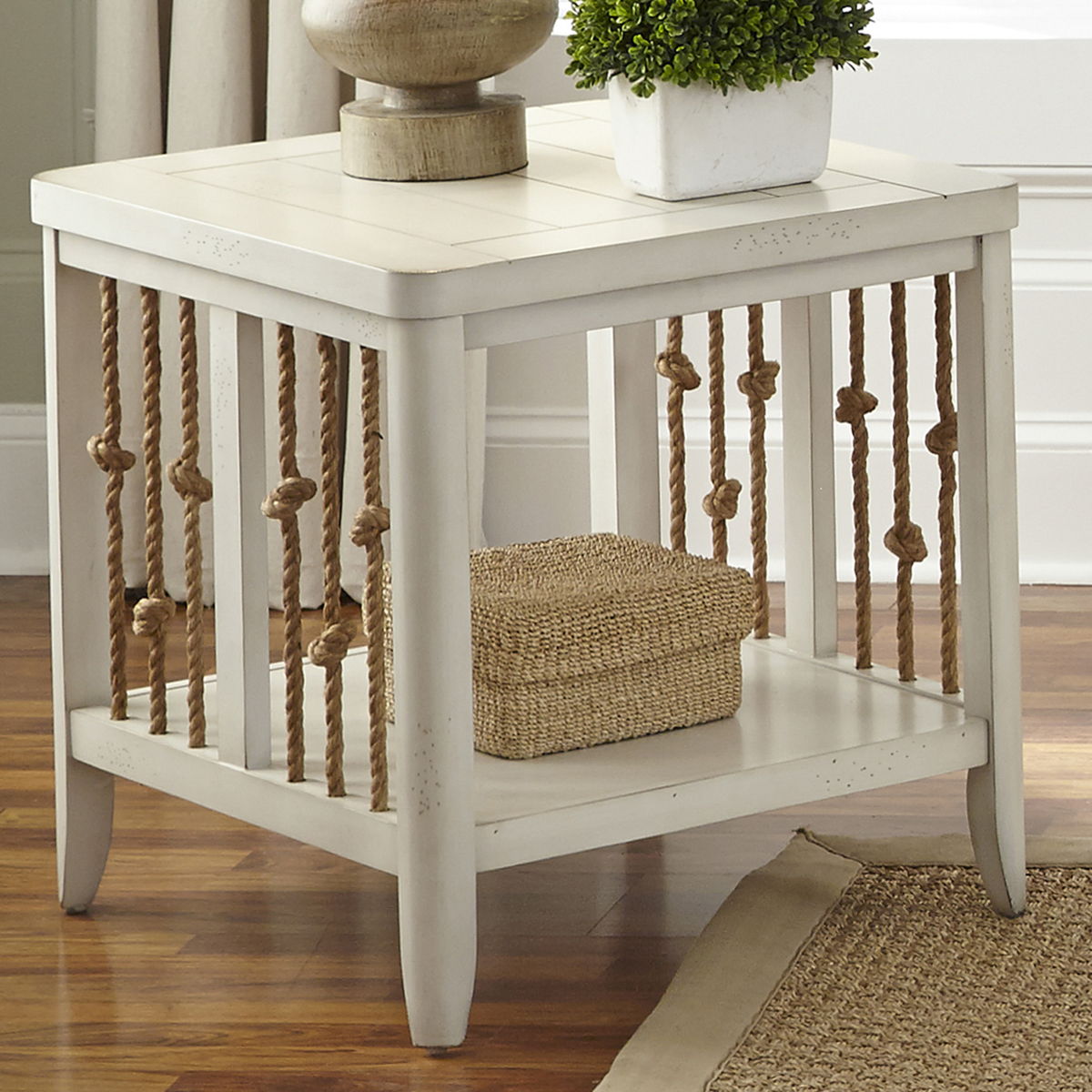 Dockside is a great eclectic look with coastal style. Knotted rope creates the end panels on the tables and planked tops add to the casual style. The rectangular cocktail features casters and the storage trunk has weaved rope pilasters with a cedar inside lining.