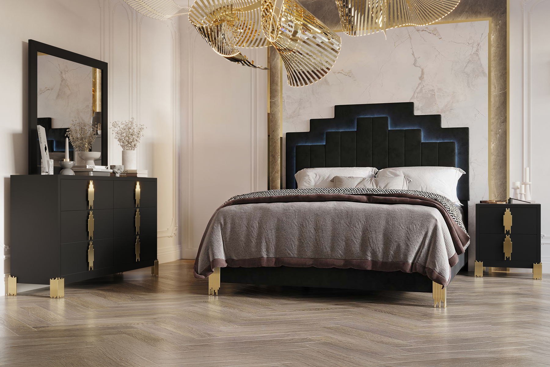 Experience the Empire Bedroom Set, a complete ensemble meticulously crafted for enduring quality and contemporary charm. Constructed from eco-friendly manufactured woods and adorned with a sleek finish, this set exudes sophistication. The tiered panels, complemented by gleaming gold drawer pulls and feet, evoke the allure of a city skyline at night. Enjoy added ambiance with blue LED accent strips illuminating the headboard”s panels, easily controlled for mood lighting. Inside, the drawers boast English dovetail joinery and ball bearing glides for smooth operation. With ample storage space in the six-drawer dresser and the five-drawer chest, this set combines beauty with functionality, offering a stylish storage solution for your bedroom essentials.