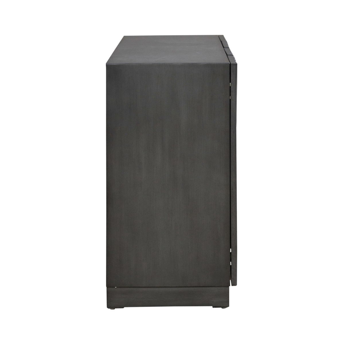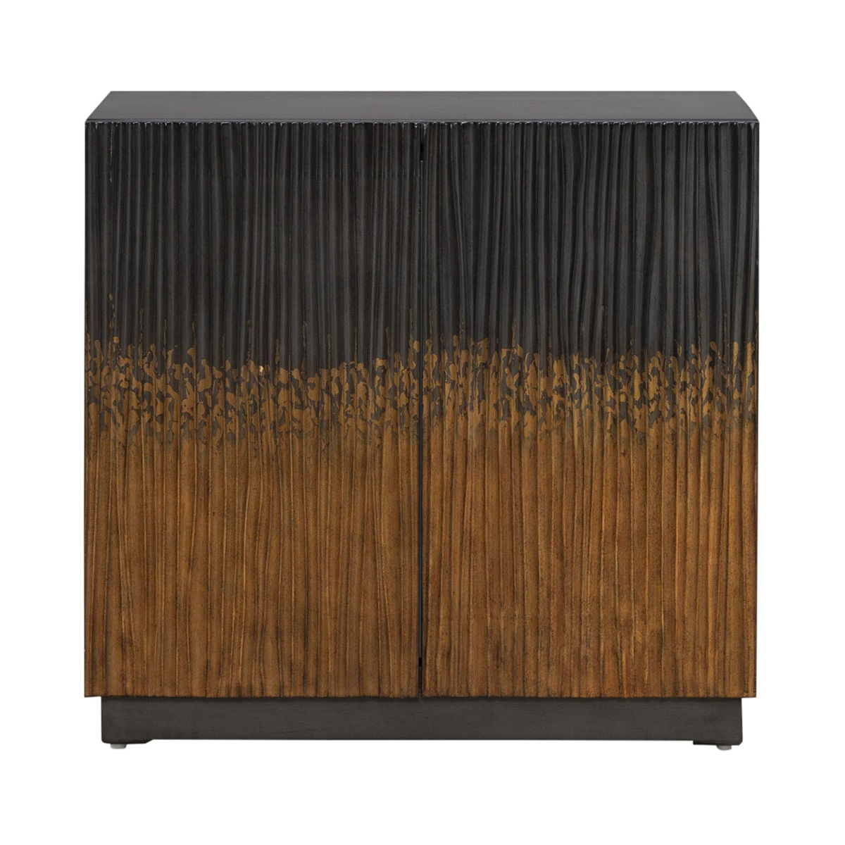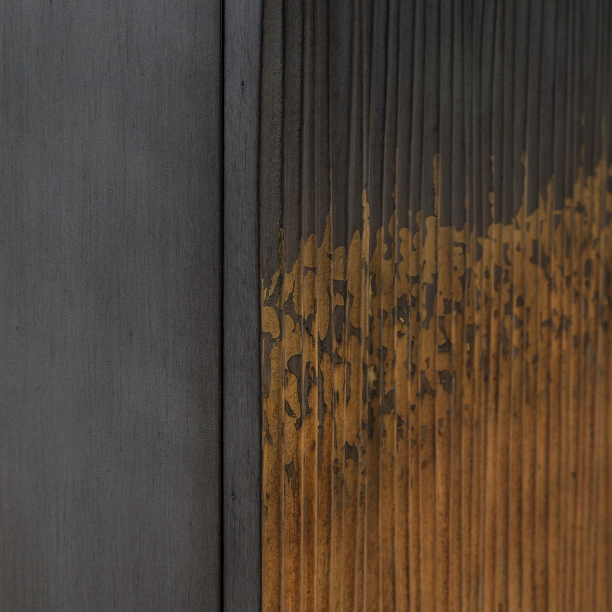 Features reeded pattern doors with abstract visual interest. The door pattern is reminiscent of a dancing flame. The doors are supported by European soft close hinges and a push latch system. There is one fixed wood shelf behind each outside door and one large fixed shelf behind the set of center doors. The case is supported by a plinth style base.