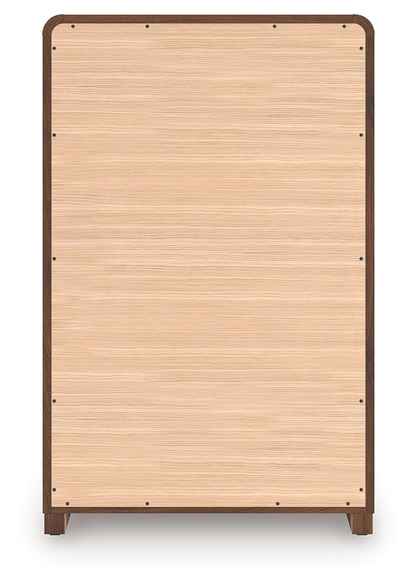 Grace your restful retreat with an added dose of refinement. This chest of drawers showcases a stunning rich brown wood tone, with sleek drawer pulls for an added layer of luxury. A rounded top softens the silhouette, elevating the look. It’s curated, contemporary and utterly chic.