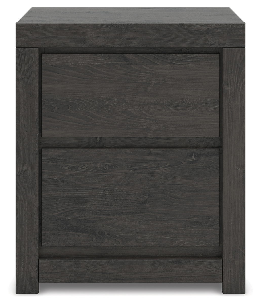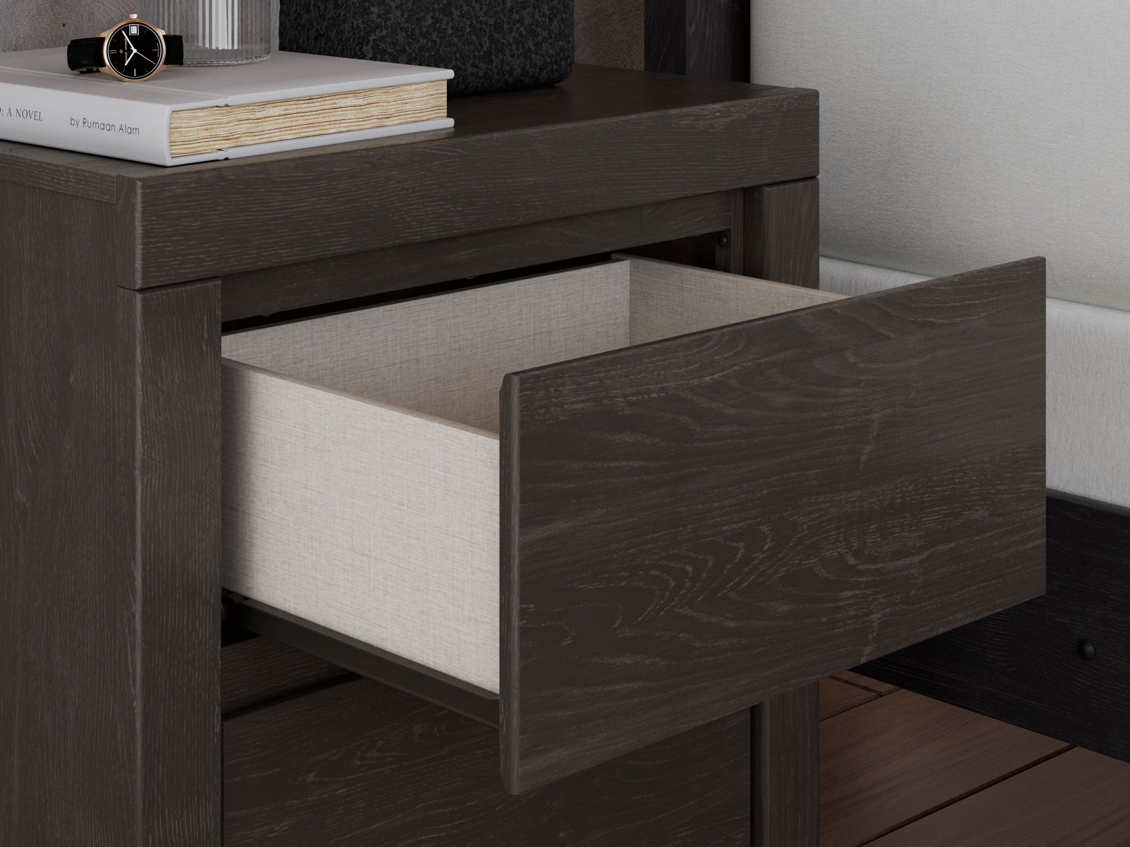 Find serene simplicity in the clean lines and dark neutral tones of this nightstand. It’s a sincere approach to modern elegance, giving you high style at a great value. A sleek hardware-less design creates a fuss-free look. Winding down before bed? Keep essentials close with the nightstand’s smooth-gliding drawers and USB charging.