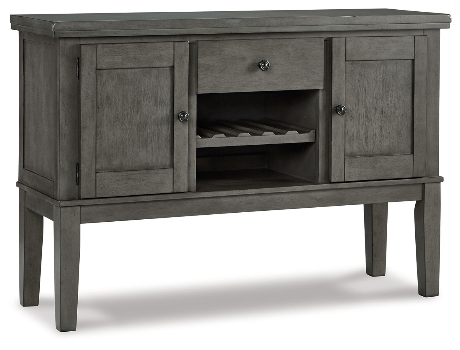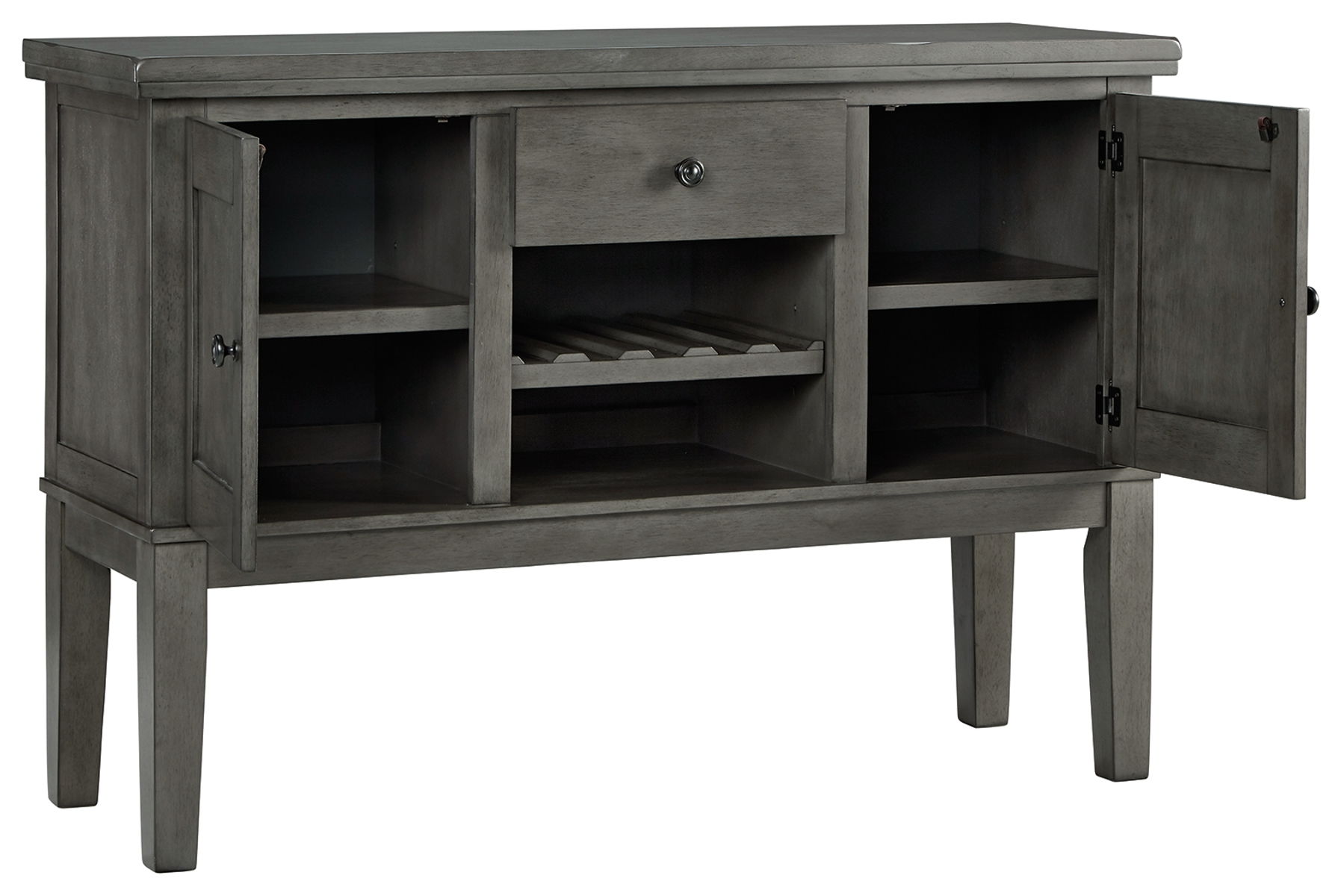 Cool and on-trend. This versatile server sports an antiqued gray color for a contemporary-yet-casual feel. The server features two cabinets, a smooth-gliding drawer and an open cubby with a wine rack, making it a breeze to clear away clutter and expand your serving space. Dining with friends and family has never been so stylish.