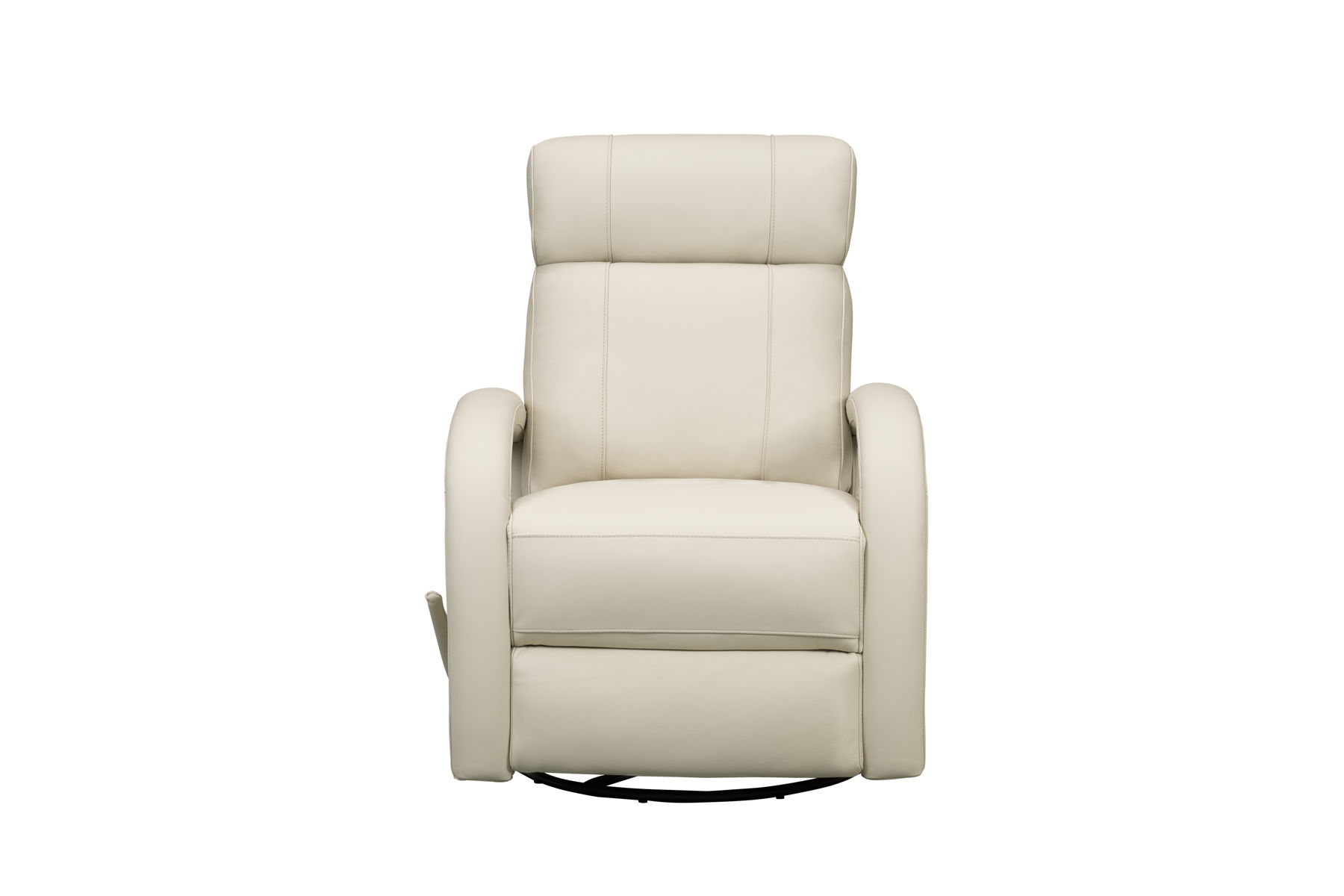 Contemporary open arm design, 360-degree swivel glider recliner with handle activated recline. Split pub back, boxed style pad over chaise seating with pocketed coil springs, plushily padded radius track arms, and single needle top stitch detail. A statement piece for any room
