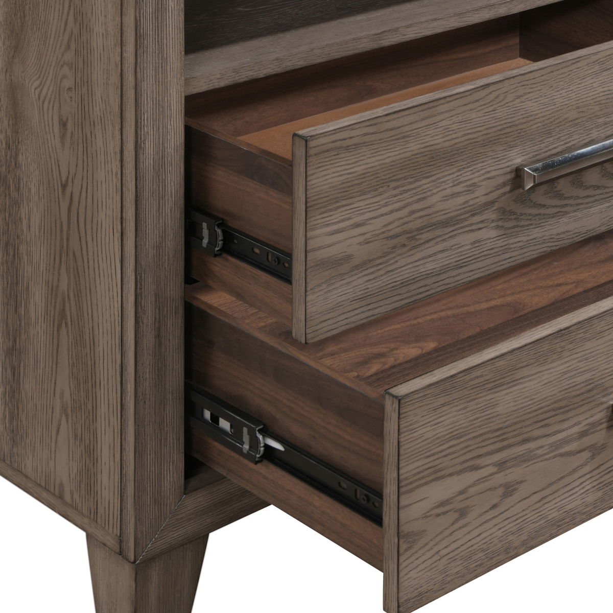Crafted from solid rubberwood, engineered wood, and oak veneers, the Harrisburg 2-Drawer Nightstand offers lasting strength and timeless style. A rich walnut finish highlights the natural wood grain, while dovetail drawers with full-extension glides and velvet-lined interiors offer smooth, snag-free storage. A built-in USB charging port adds modern convenience, blending classic craftsmanship with everyday functionality.