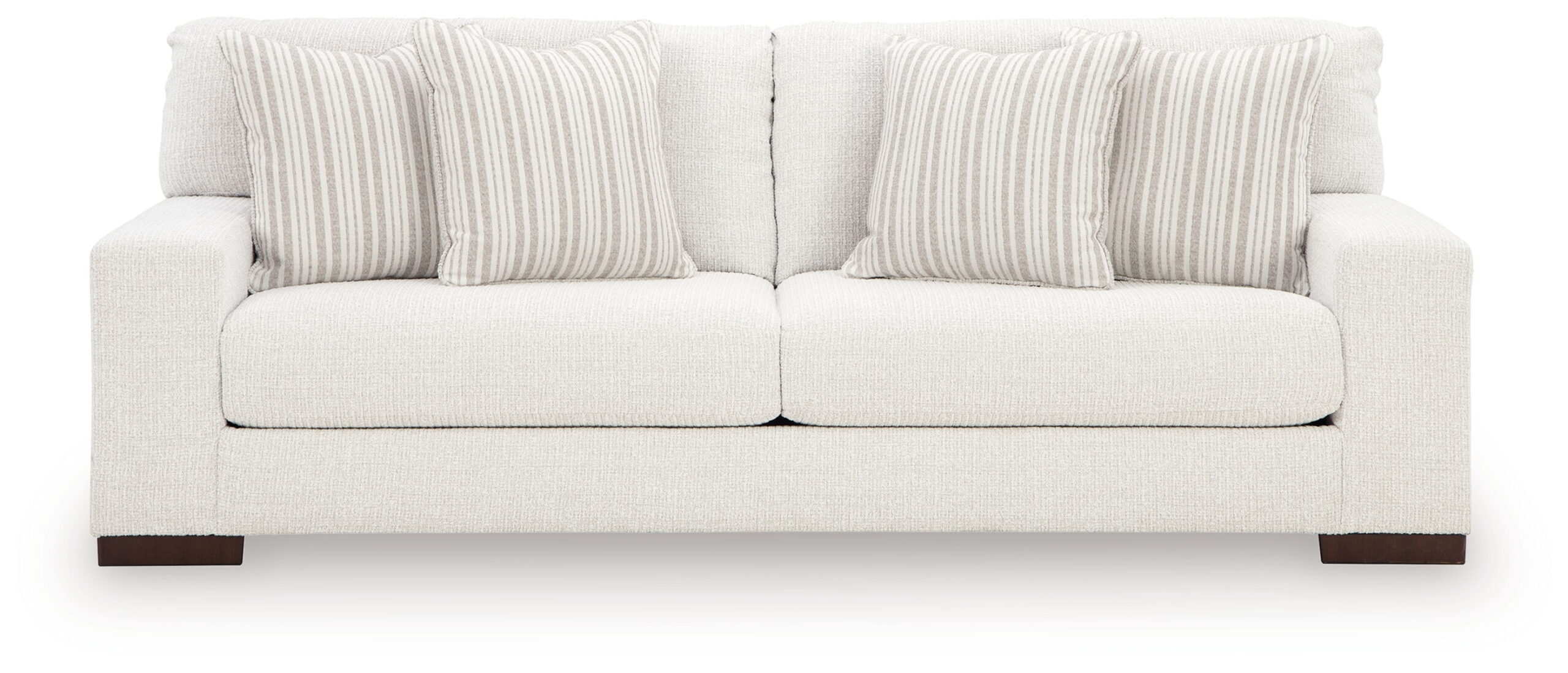 Easy on the eyes and irresistibly comfortable, this sofa blends beautifully into any setting. Contemporary wide track arms and plush cushions covered in soft, stain-resistant Next-Gen Nuvella™ upholstery lend this set a sense of everyday ease. Simple striped accent pillows in complementary colors add subtle contrast.