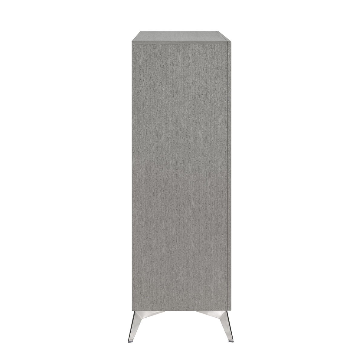 The Huxley 5-Drawer Chest combines contemporary glam with durable construction for a stylish addition to your bedroom. This vertical dresser is crafted from manufactured woods and eco-friendly decorative laminate, ensuring it will stand the test of time. The design features clean lines with metallic accents and flared silver legs, adding a modern touch. Its rich finish provides a sleek, sophisticated look that is both timeless and modern, highlighting the metallic accents and smooth surfaces for a chic and polished aesthetic. The quality drawer construction includes English dovetail joinery and smooth-rolling center glides for long-lasting operation. Functional and fashionable, this chest offers ample storage for clothing, with chic, crystal-studded drawer pulls for easy access.