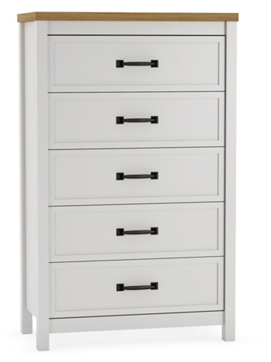 For style that’s simultaneously relaxed and refined, look no further than this chest of drawers. Its crisp, clean white finish pairs with replicated oak for a versatile look with loads of casual appeal. Contrasting hardware with a simple dark hue incorporates added depth. Smooth-gliding drawers, complete with a matching white finish inside, deliver everyday convenience.