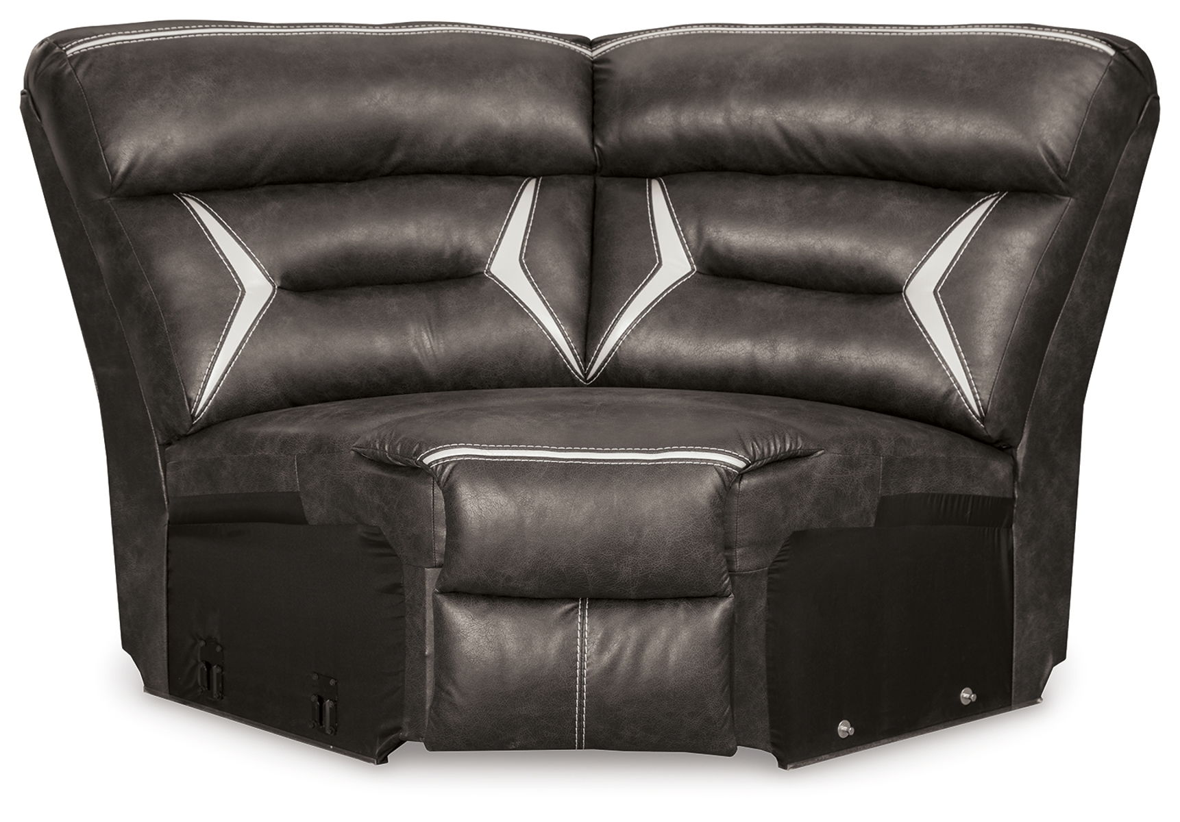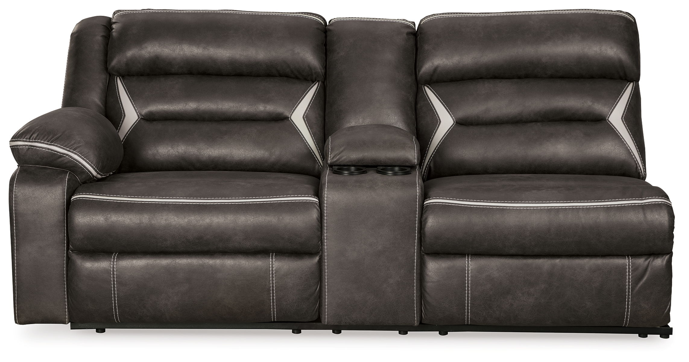 You could play it safe. Or you could choose to stand out in the crowd with this brilliantly styled sectional with power. Ultra cool, ultra contemporary and ultra comfortable, this fashion-forward sectional sports a fabulous faux leather enhanced with contrasting stitching that’s right on point. Rest assured, sumptuous pillow top armrests and sleek channel cushioning feel every bit as good as they look. Enlightened elements include a power control with USB plug-in and blue LED lighting (by the cup holders) to create a home theater experience worthy of A-listers.
