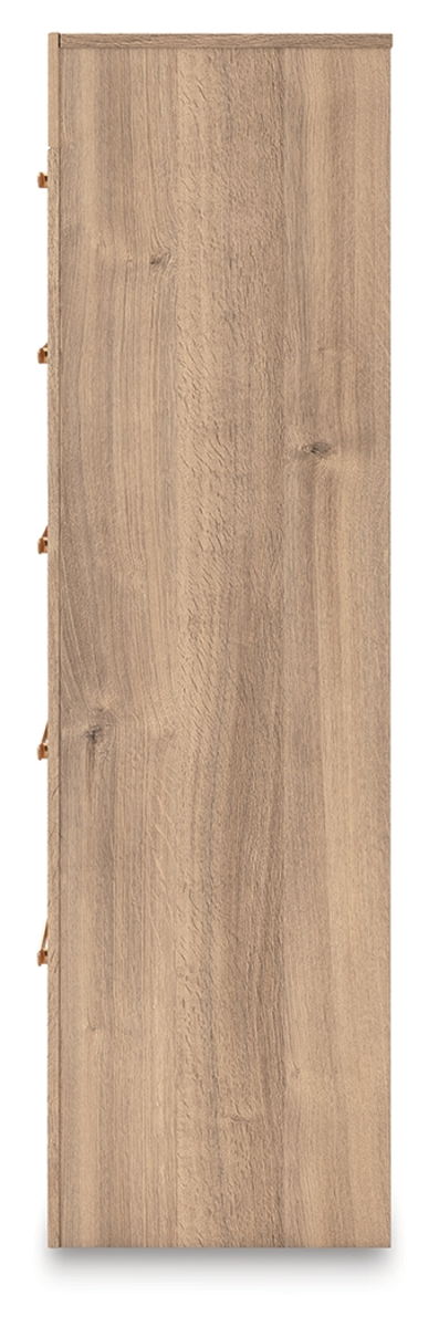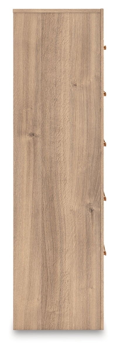 The natural wood tones and clean lines of this chest of drawers echo your easygoing style sensibilities. With a warm finish and replicated oak grain, its carefree character lightens up your bedroom. Curved inner corner details soften the look, while sleek bronze-tone hardware modernizes the feel.