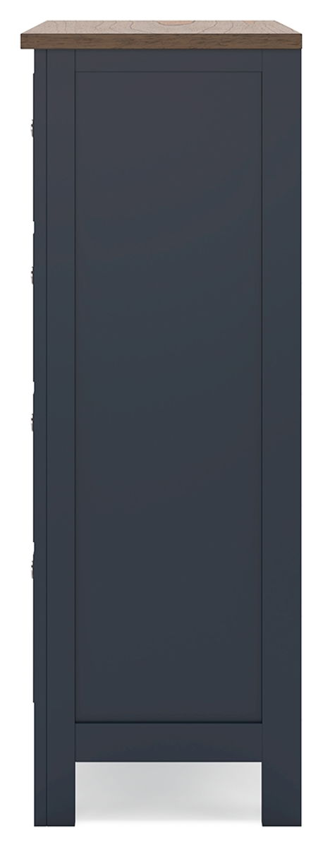Add homespun charm to your restful retreat. A modern take on a timeless silhouette, this chest of drawers pairs a dark slate blue finish with a light brown top. Drawer fronts and legs in a classic Shaker style bring an air of beautiful simplicity to the bedroom. Whether it’s part of a charmingly curated guest suite or a casually carefree kids room, this chest is a welcome addition.