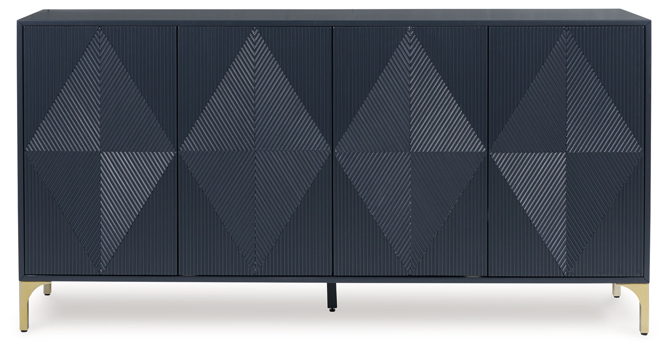 Elevate your aesthetic with the chic design of this accent cabinet. Sleek goldtone legs and striking doors with a geometric pattern infuse contemporary flair wherever you place this piece. Add a dark blue finish, and you’ve got a stunning showstopper. Providing function to form, the cabinet’s push magnetic doors reveal two shelves and openings for electronics.
