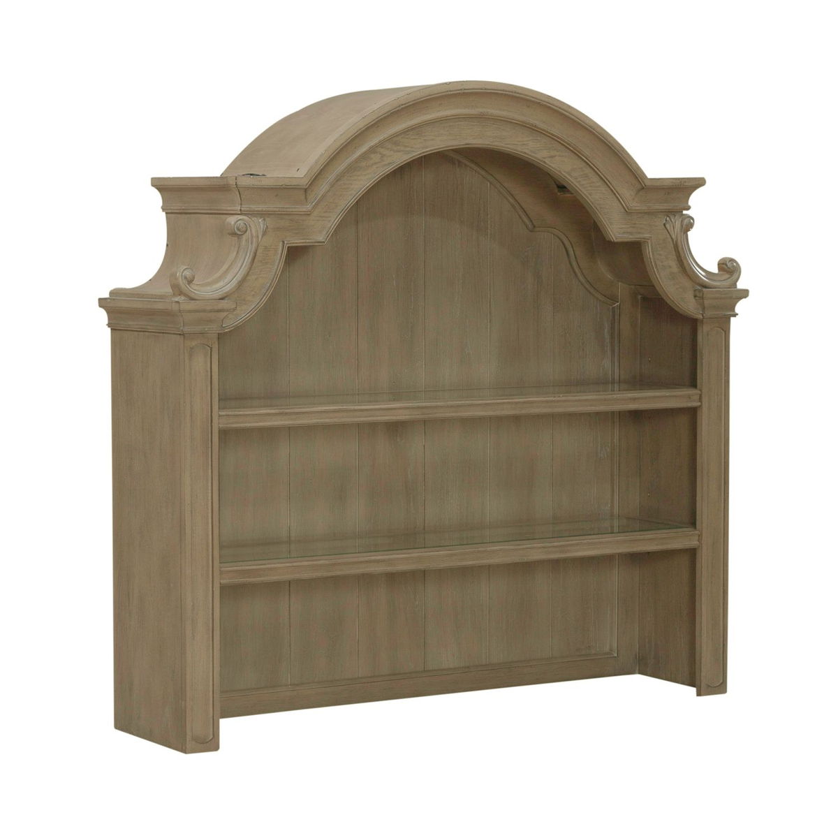 Features planked back panel, two wood framed adjustable shelves, heavily craved bonnet top and LED touching lighting. Cannot stand alone. Pair with the buffet to make a complete set.
