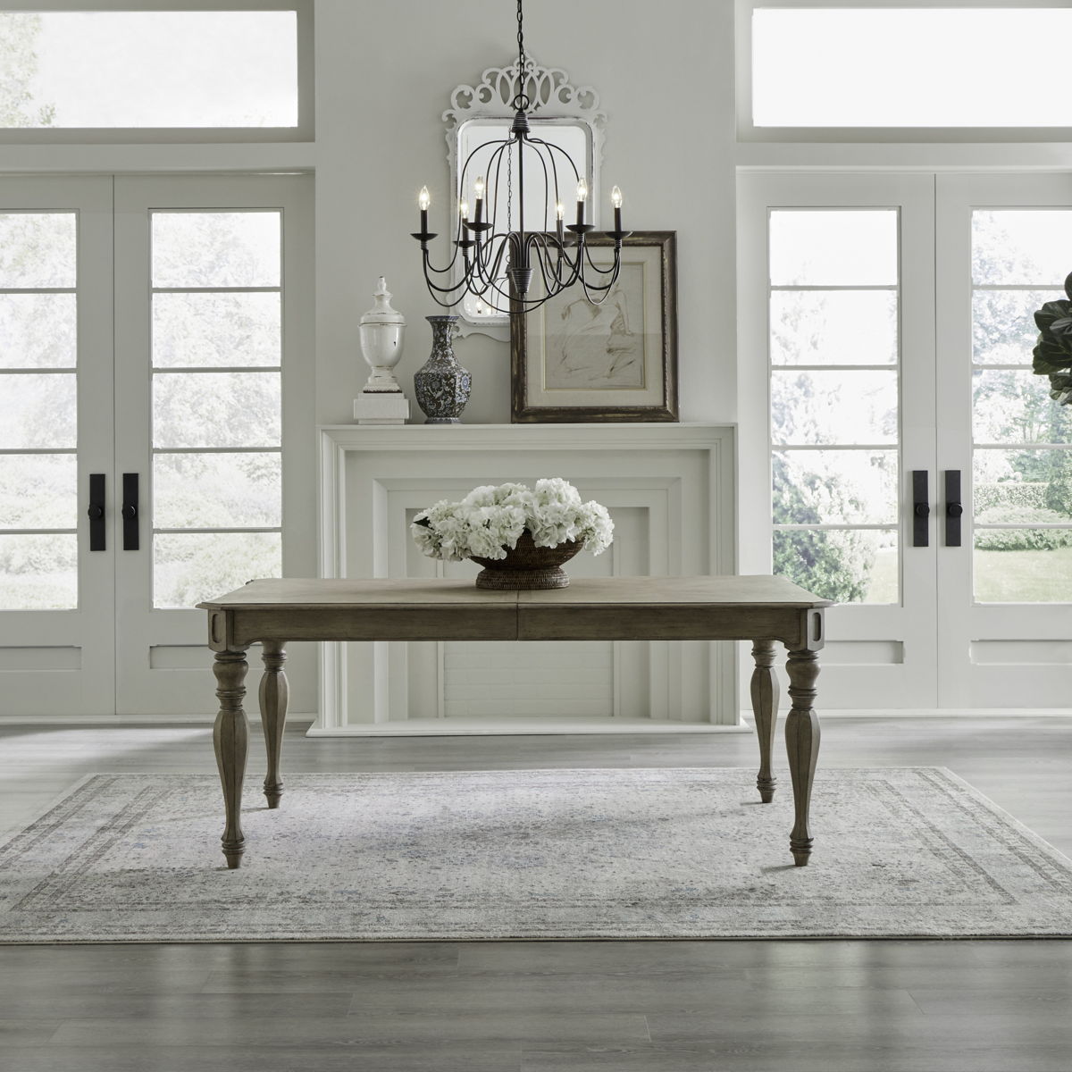 Gather in style with the Magnolia Manor rectangular leg table. Crafted of poplar solids with white oak and birch veneers, this piece features the perfect blend of European design with a weathered top, one 18-inch removable leaf, a fancy face veneer dining top, canted corners, and is anchored by faceted turned legs. Warm antique finishes and artistic distressing along with grand scale a group to be passed to generations.