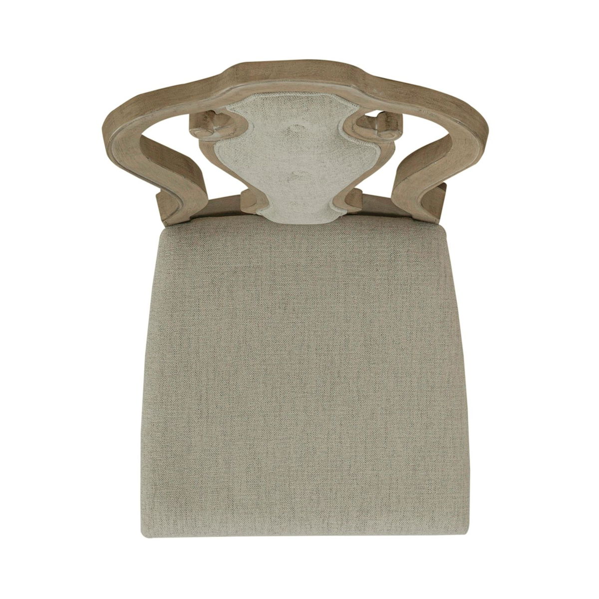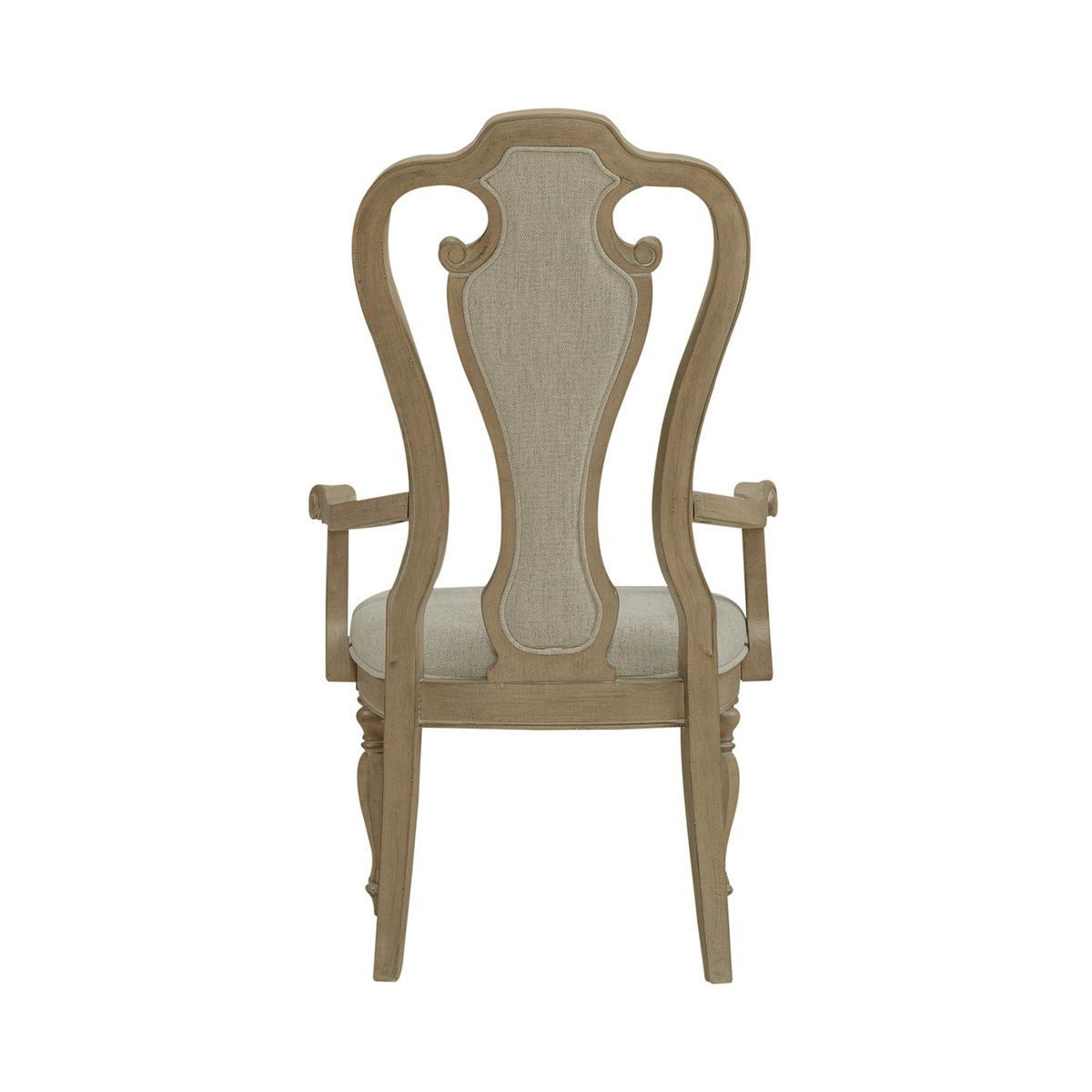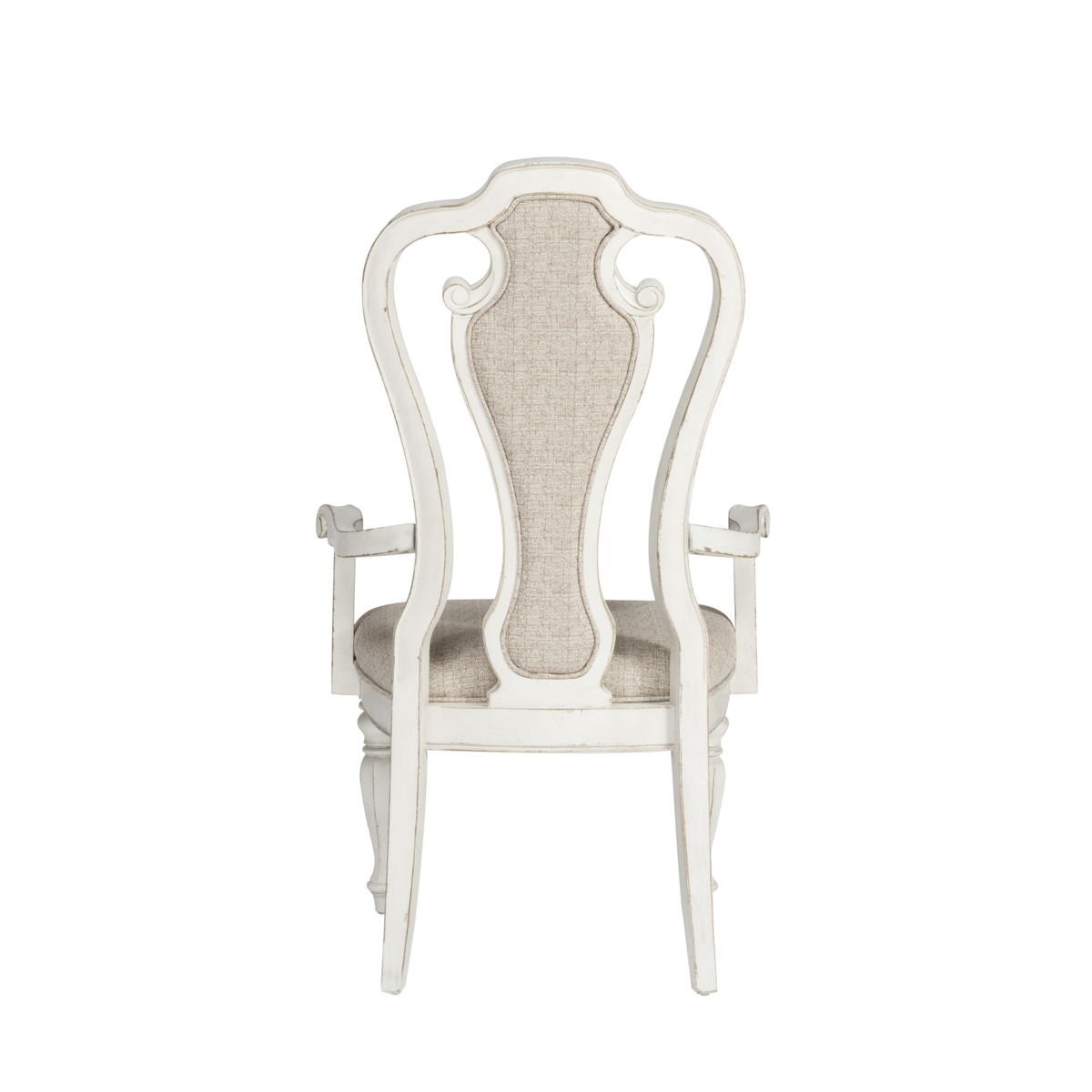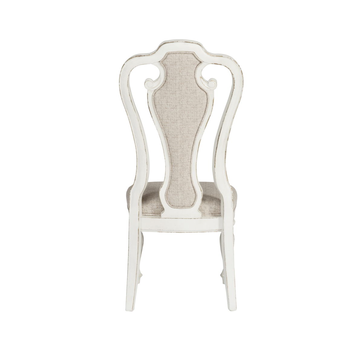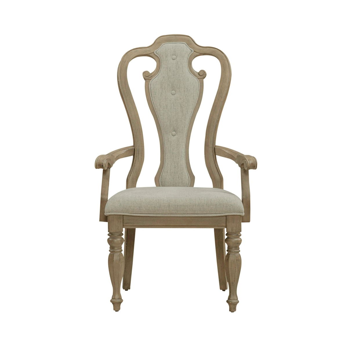 Sit in comfort with the Magnolia Manor splat back upholstered chair. Finished in an antique with heavy chipping and crafted of rubberwood solids, the upholstered back is button tufted in a chenille fabric laced with tones of white, tan and brown threads. The splat back is accented with the dog bone carvings while the arms are slightly curved for a comfortable fit. The seat flows into beautifully faceted turned legs with nylon chair glides.