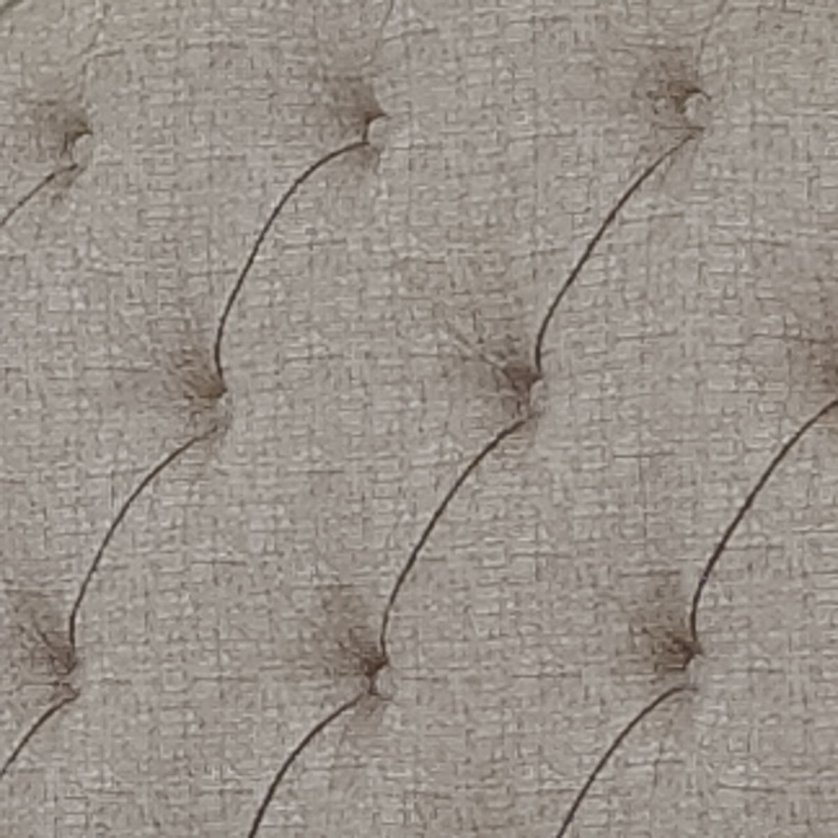 Accent your bedroom with the perfect blend of European Traditional design and casual appeal using the Magnolia Manor Upholstered Headboard. Finished in a weathered brown and antique white finish with heavy chipping combination this piece is crafted of poplar solids and white oak and birch veneers.The upholstered headboard is button tufted in a chenille fabric laced with tones of white, tan and brown threads and features an arched crown with dog bone accents on each corner adding definition and character. The headboard will work with a metal bed frame or the panel footboard and rails.