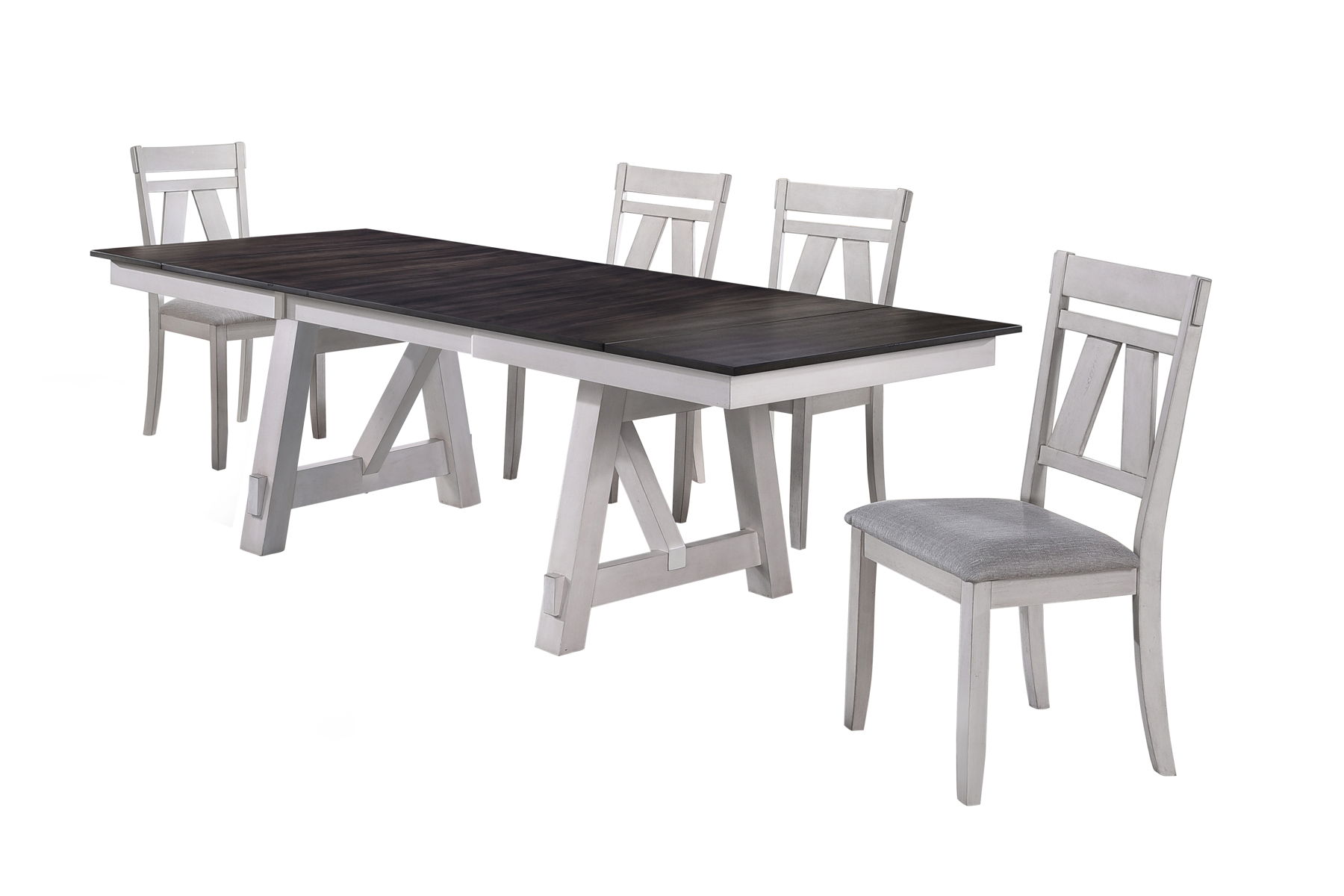 The Maisie Wood Dining Set combines quality construction with modern rustic style, making it a perfect addition to any dining space. This set includes a two-tone dining table with self-storing leaves and dining chairs. Crafted from solid rubberwood, manufactured woods, and Mindy wood veneers, this dining set is built to last. The table features a dark brown tabletop that contrasts beautifully with slightly distressed base and chairs, enhancing its farmhouse appeal. The chairs are designed for comfort, with resilient foam cushions wrapped in an easy-care polyester/cotton blend fabric. The expanding table, which can seat up to eight people with its two 14″ self-storing leaves, is ideal for hosting family gatherings. The Maisie Dining Set seamlessly blends rustic charm with modern design, creating a dining space that feels both fresh and timeless. This set is a smart investment for those looking to combine style, comfort, and functionality in their dining area.