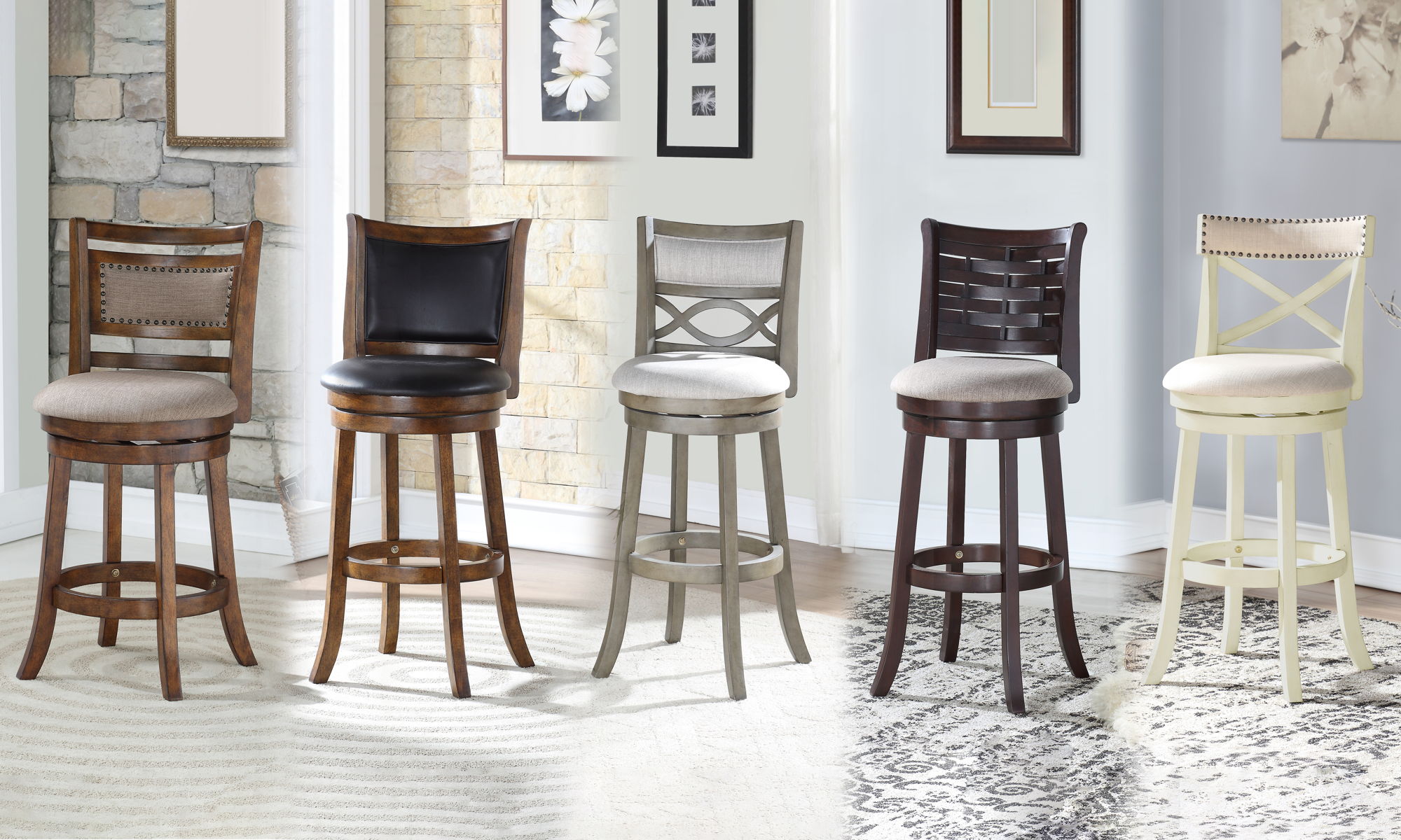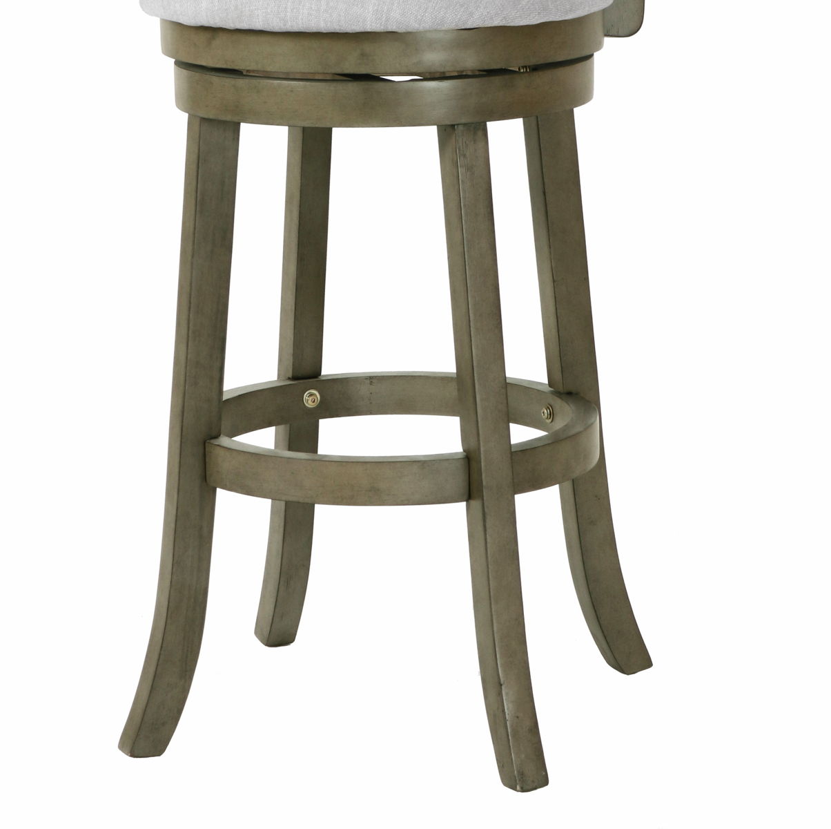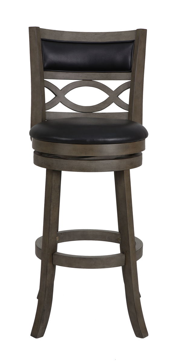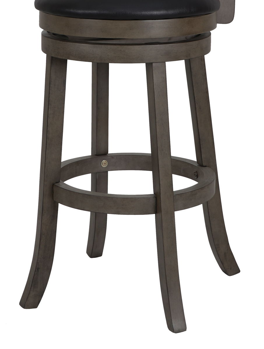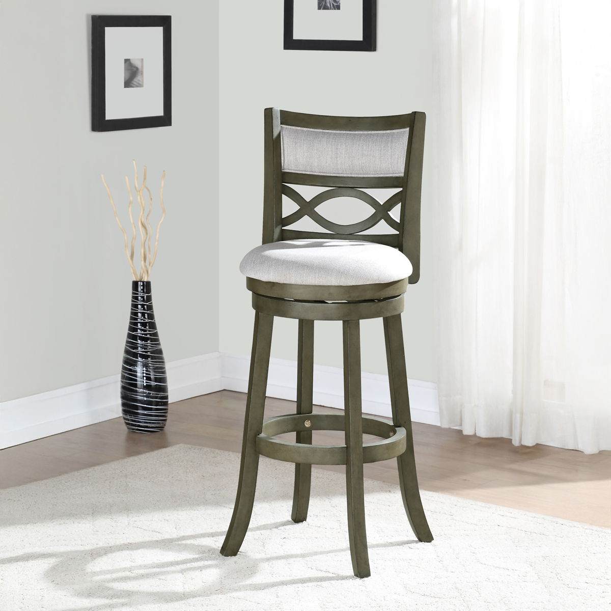 The New Classic Furniture Manchester Pub Height Swivel Bar Stool is a functional and durable seating solution designed for comfort and style. Crafted from quality Rubberwood solids and manufactured wood, ensuring long-lasting strength. Featuring a seat height of 29”, the stool’s legs are reinforced by a circular footrest, providing added stability and functionality. With a 360-degree swivel, this barstool effortlessly rotates for convenient use at kitchen islands or bars. The full foam seat cushions and backrests, upholstered in easy-care light gray 100% polyester fabric, offer a plush and cozy seating experience. The distinctive interlocking wave wood back and thickly welted upholstery add a touch of sophistication to the overall design. Easy assembly is a snap with the included instructions. Elevate your bar, counter, or kitchen island with the Manchester Bar Stool, where durability meets distinctive style.