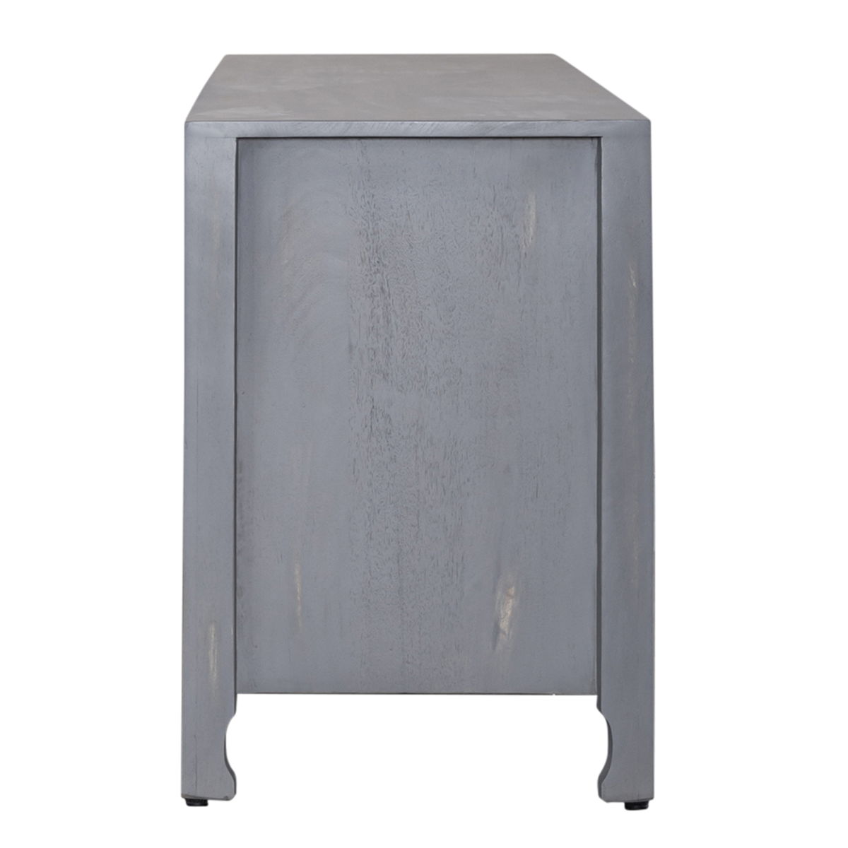 Marisol accent TV console gives you that Boho chic feel that is so popular today. Boho is a mix of colors, styles, and materials to create a carefree causal comfortable space. Crafted of solid mango with a soft finish. Features three artisan hand craved doors in a floral pattern, one fixed shelf behind each door, shaped block legs with antique brass knob hardware. Perfect as a TV console.